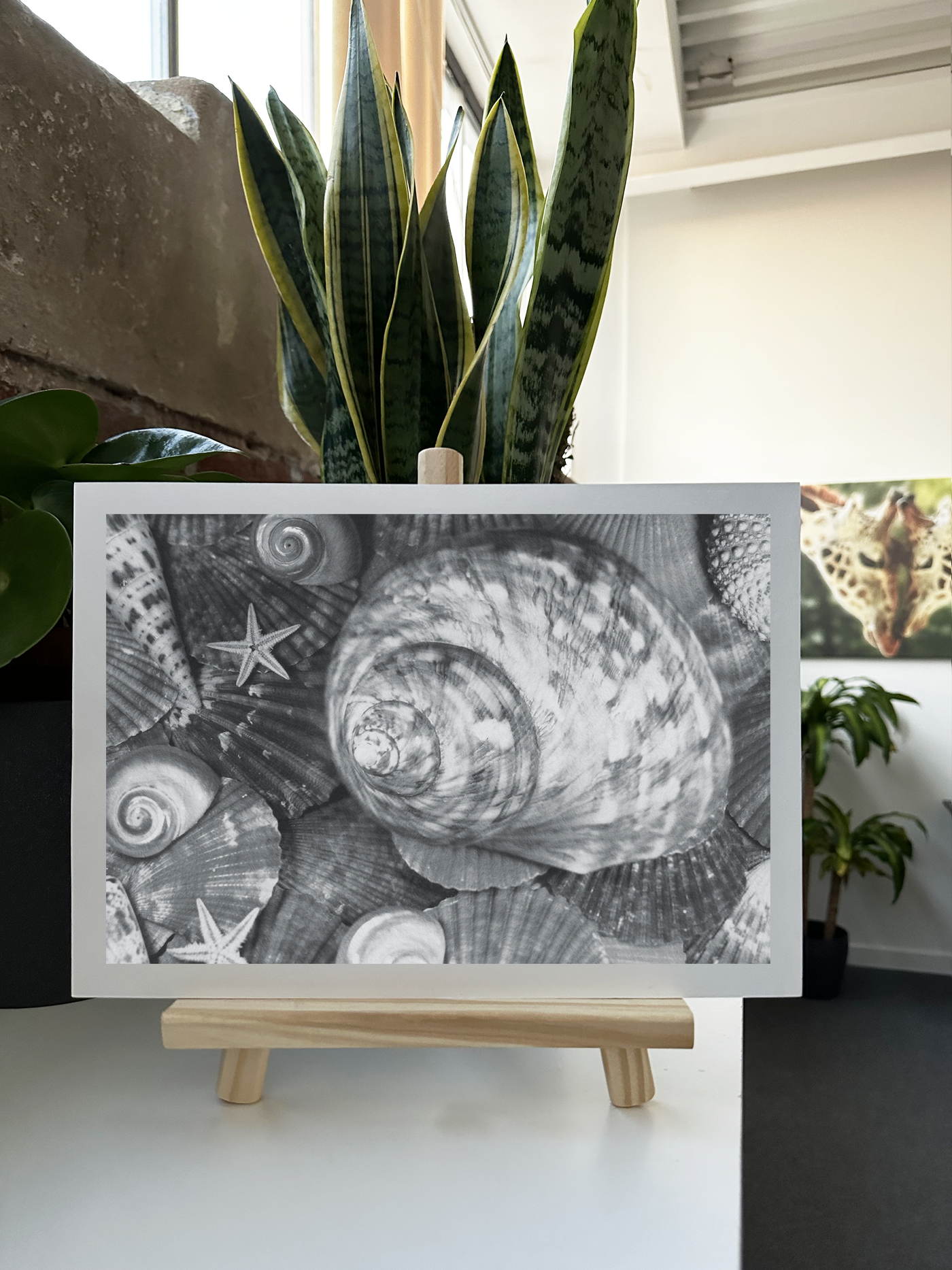 A vivid masterpiece of Monochromatic tonality, this image features the best nature has to offer in seashells. With the silvery textures of the Calico scallops, the bright light & dark tones of the Turbinidae and holography of the Nautilus shells, it really is a beach party on Fine Art paper. The vibrancy is complimented by the muted Monochrome hues of the Beaded Asteroidea starfish and the Conidae shell to make this the perfect Monochrome Fine Art print.