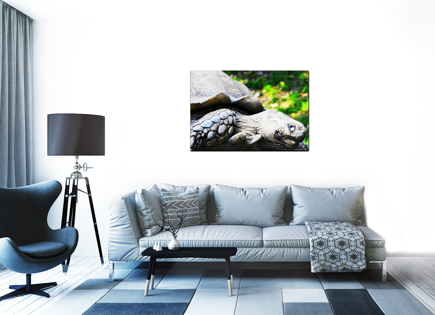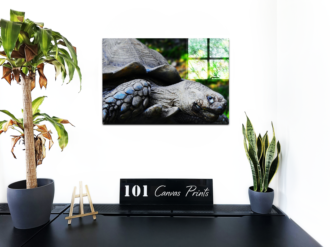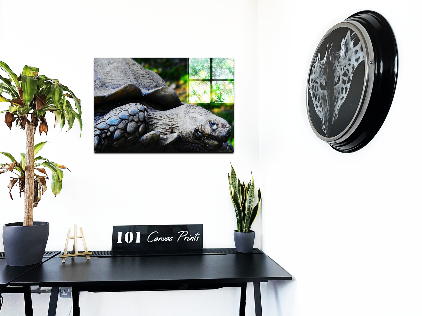 Printed and set behind Acrylic, this image takes on a new dimension of vibrancy and depth. The transparent quality of the medium creates an almost three-dimensional effect, as if the tortoise is emerging from the print itself. This striking Acrylic piece would make a bold statement in a modern home or office, particularly in spaces with contemporary décor where its glossy finish can catch and reflect the light. The acrylic print's ability to enhance the image's detail and depth makes it an ideal choice for those who wish to fully appreciate the intricate beauty of this remarkable creature.