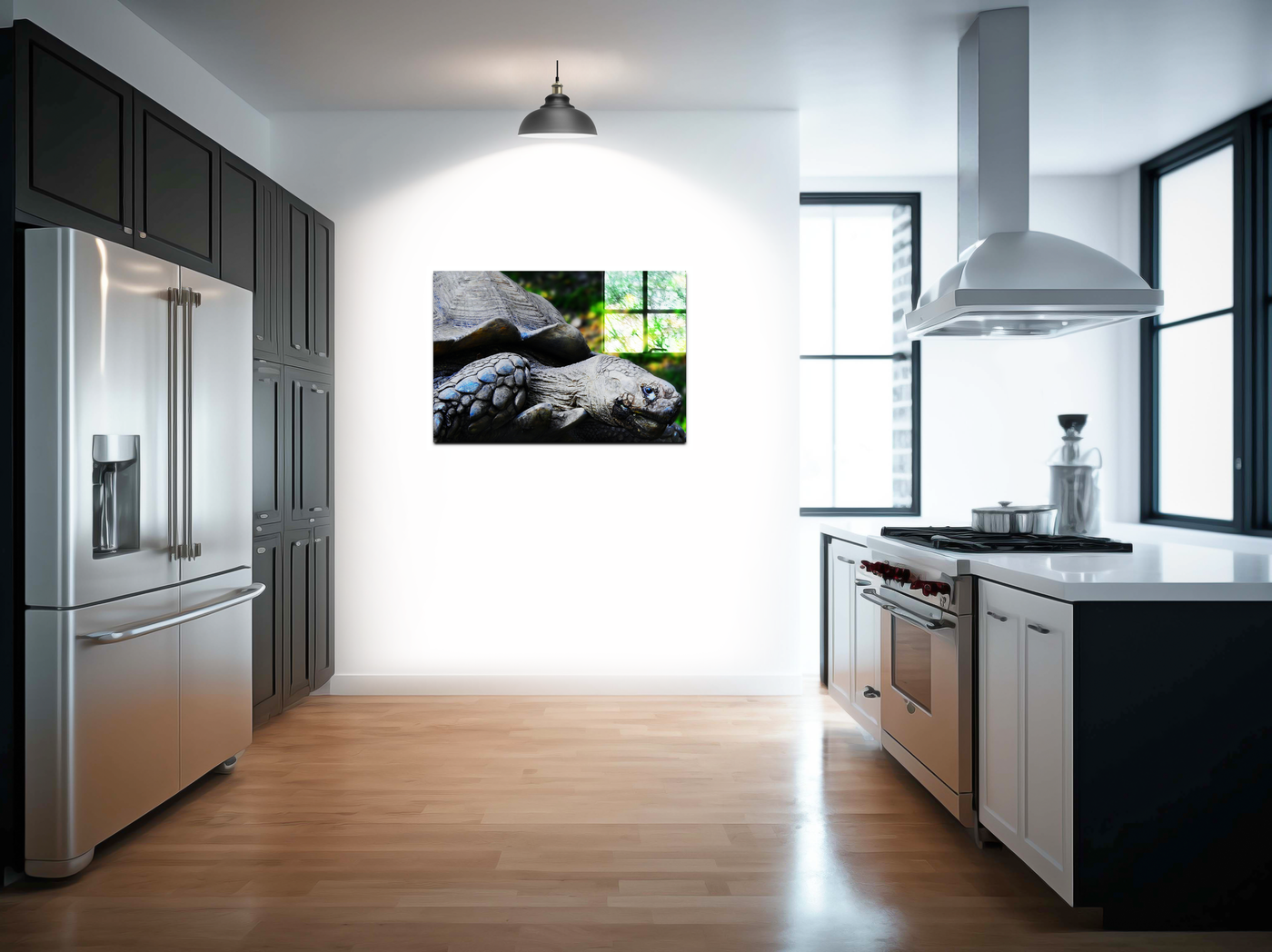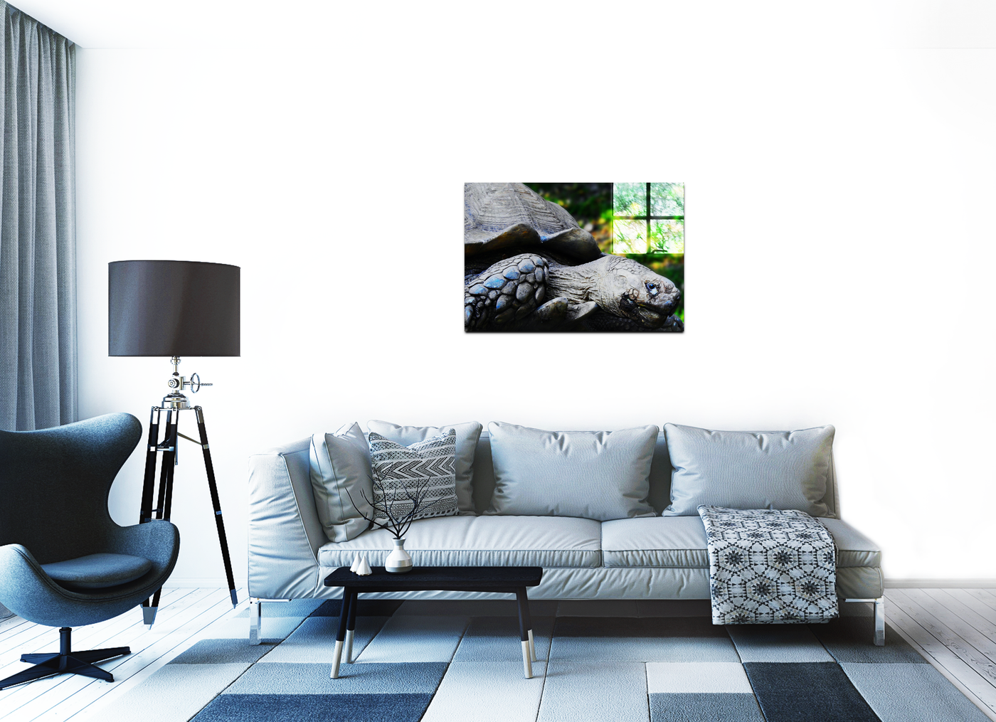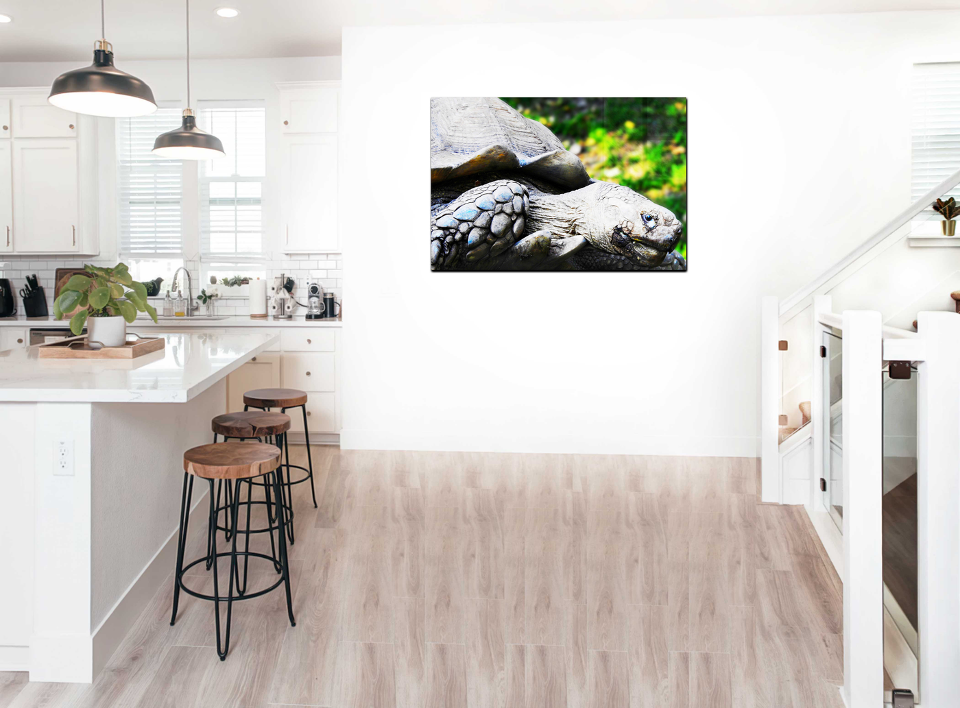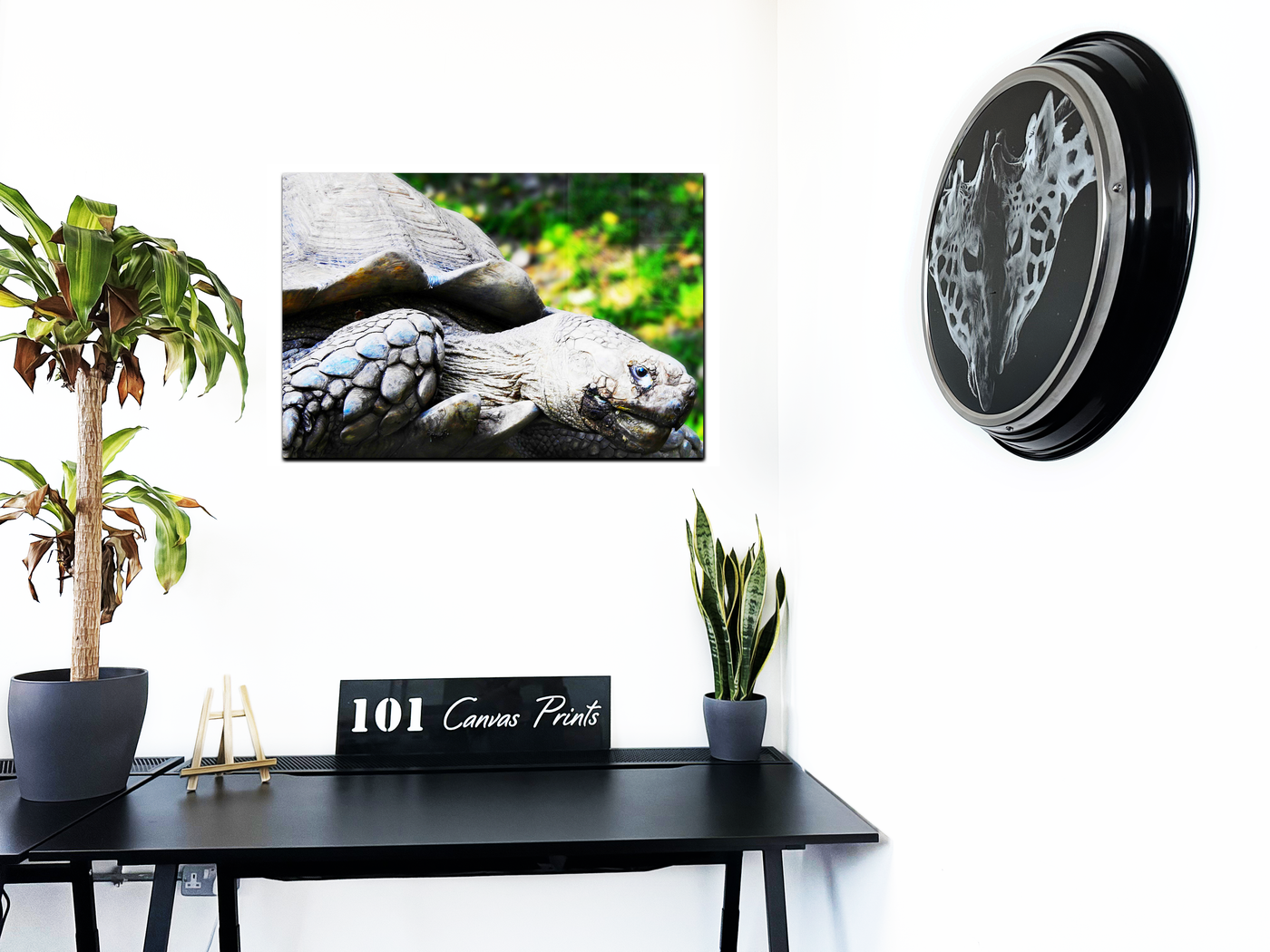 Printed and set behind Acrylic, this image takes on a new dimension of vibrancy and depth. The transparent quality of the medium creates an almost three-dimensional effect, as if the tortoise is emerging from the print itself. This striking Acrylic piece would make a bold statement in a modern home or office, particularly in spaces with contemporary décor where its glossy finish can catch and reflect the light. The acrylic print's ability to enhance the image's detail and depth makes it an ideal choice for those who wish to fully appreciate the intricate beauty of this remarkable creature.
