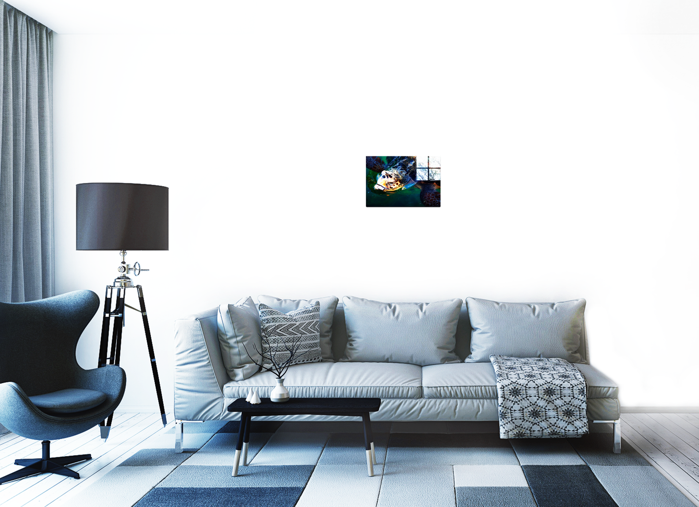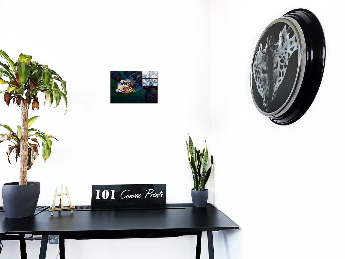 Printed and set behind Acrylic, this image takes on an almost three-dimensional quality that perfectly suits its underwater subject. The high-gloss finish enhances the play of light across the turtle's shell and through the water, creating an illusion of movement and fluidity. This dynamic piece would make a striking focal point in a modern interior, particularly in spaces with contemporary décor where its vibrant colours and glossy finish can create maximum impact.