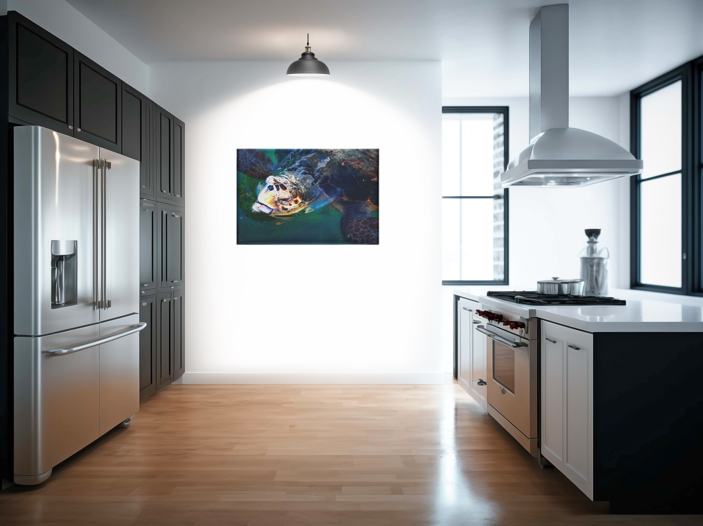 This enchanting Canvas Art print captures a sea turtle in its natural habitat, gliding gracefully just beneath the water's surface. The composition offers a unique perspective, showcasing the turtle's face and the intricate patterns of its shell as it swims through a kaleidoscope of aquatic hues.