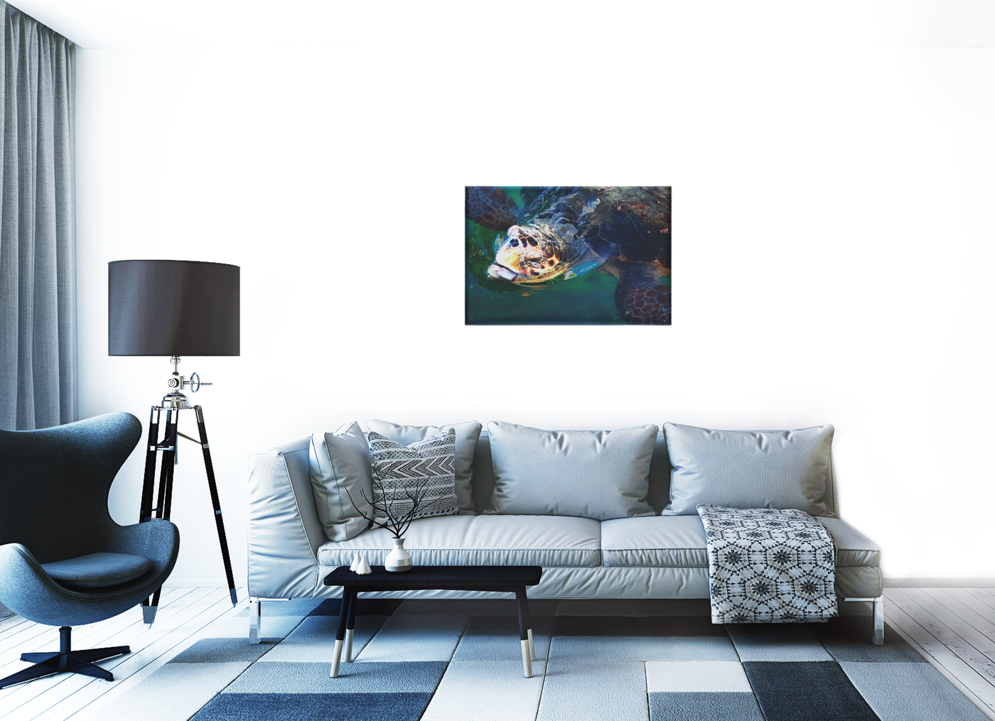 The Canvas medium lends itself perfectly to this aquatic scene, its subtle texture echoing the gentle ripples of water. The matte finish softens the overall effect, creating a serene atmosphere that invites the viewer to lose themselves in the turtle's tranquil world. This piece would be an excellent addition to a coastal-themed home, a relaxing bedroom, or any space where one wishes to introduce a sense of calm and connection to nature.