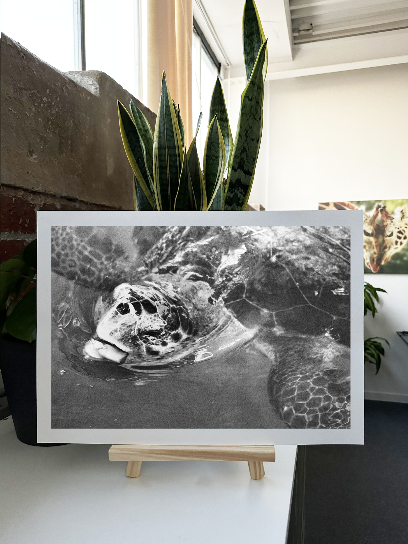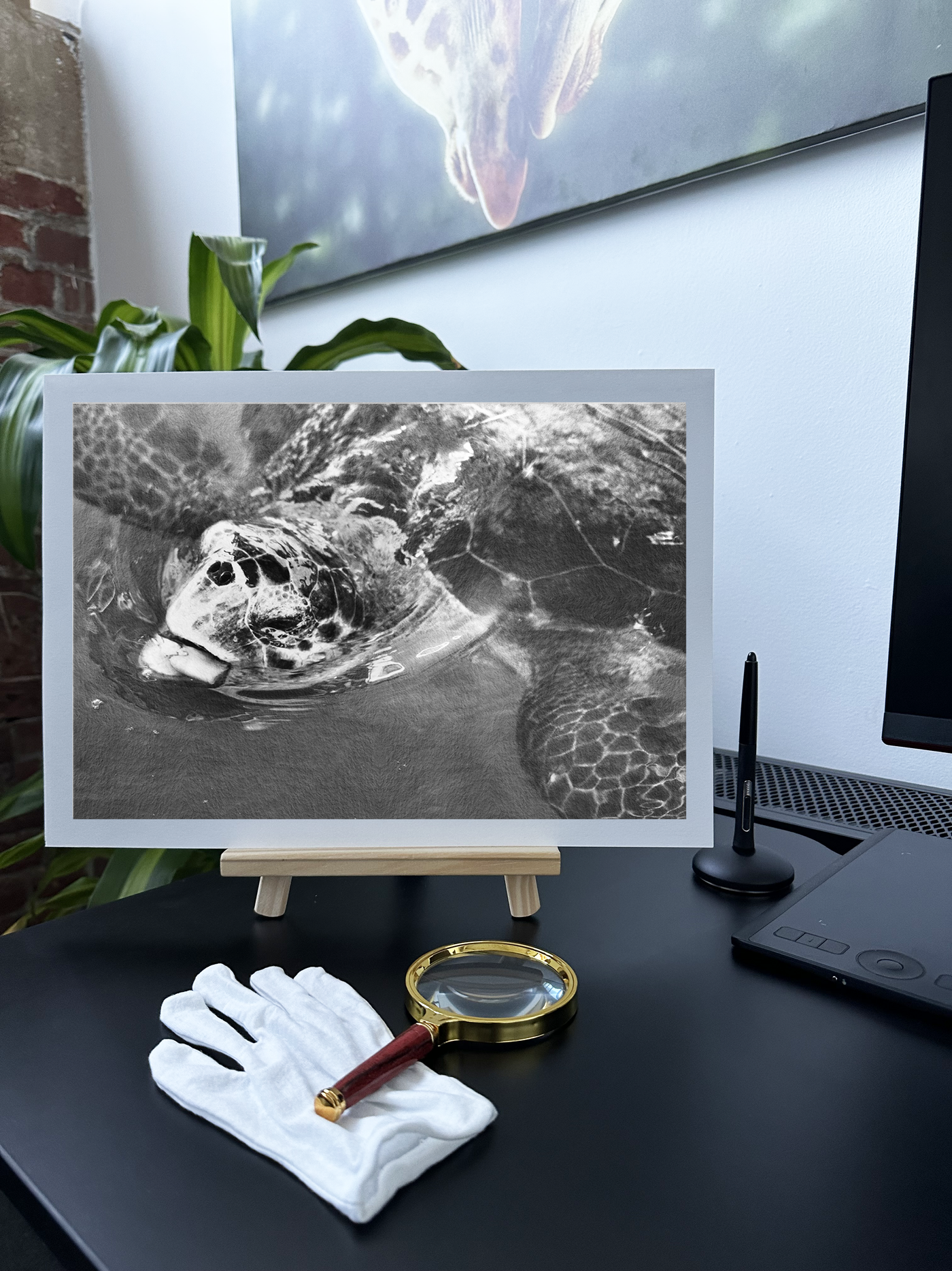 This enchanting Monochrome Fine Art print captures a sea turtle in its natural habitat, gliding gracefully just beneath the water's surface. The composition offers a unique perspective, showcasing the turtle's face and the intricate patterns of its shell as it swims through a kaleidoscope of aquatic Monochrome hues.