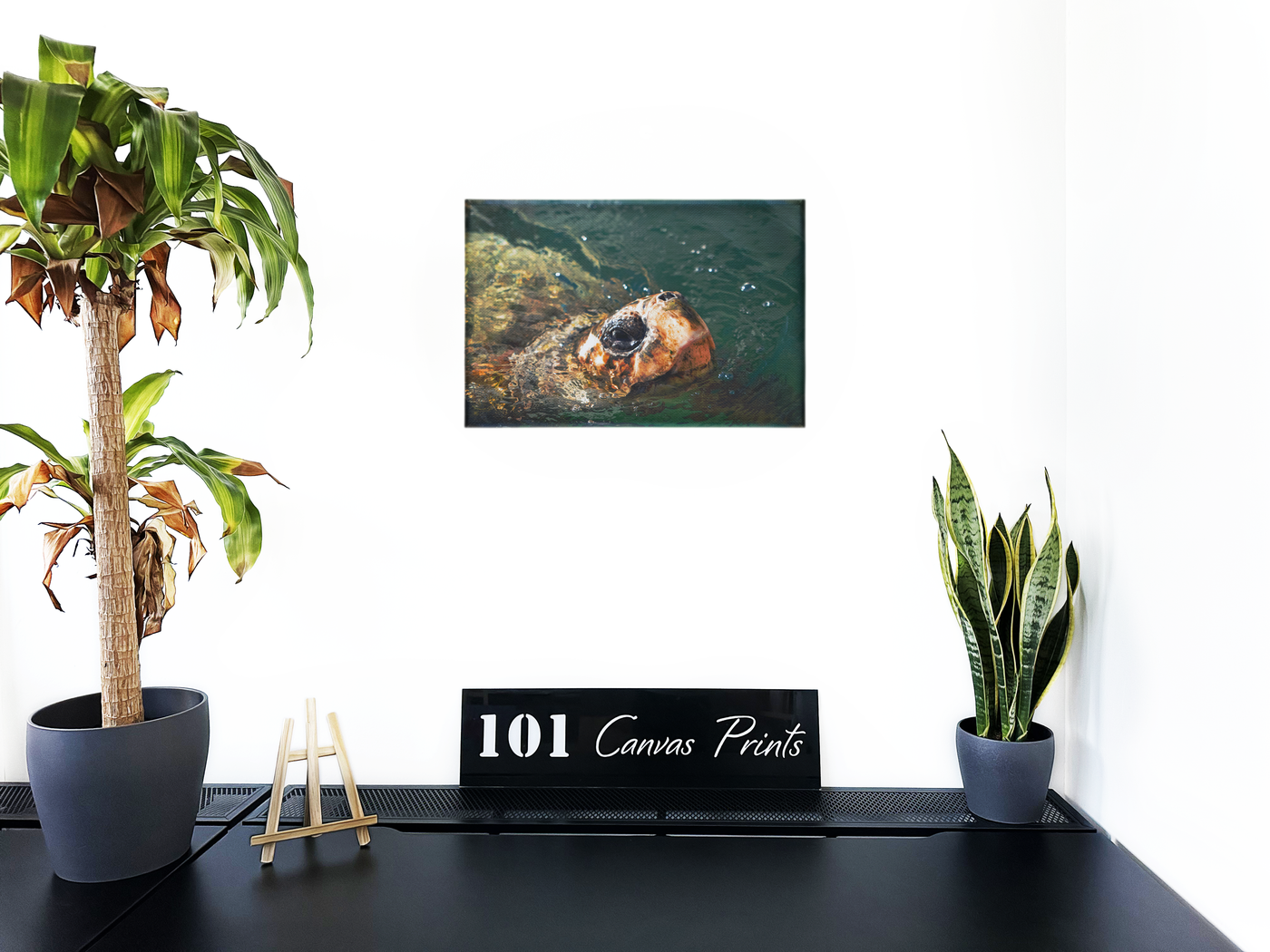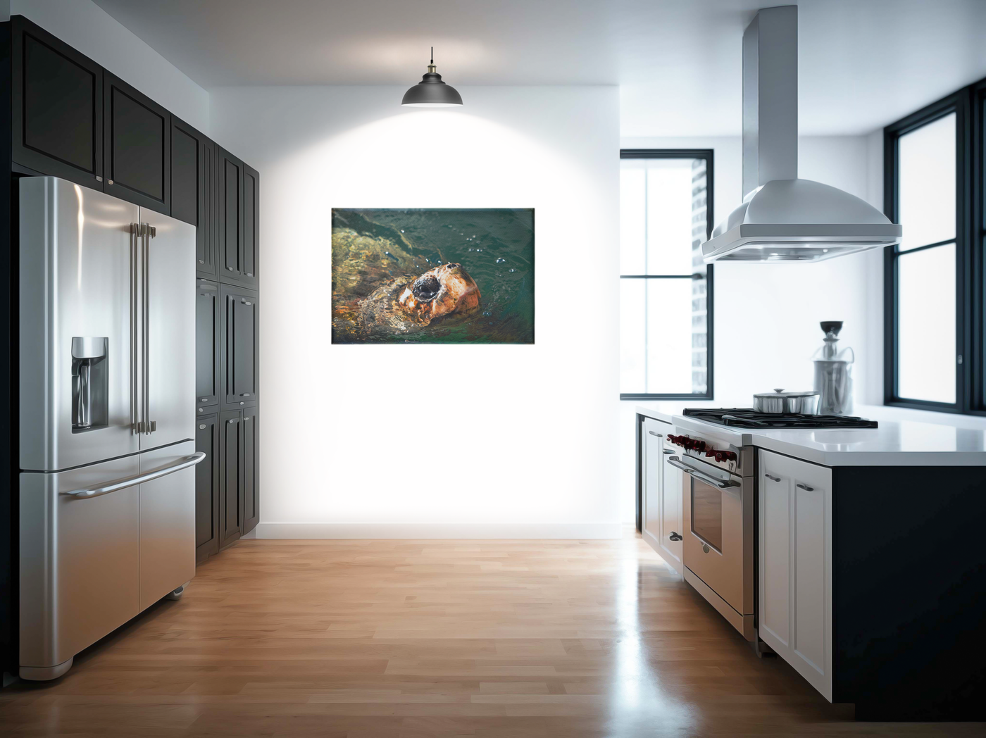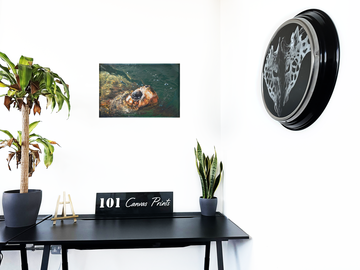 This captivating Canvas Art print portrays an intimate moment of a sea turtle breaking the water's surface. The composition masterfully captures the turtle's head and part of its shell emerging from the teal depths, creating a powerful focal point that draws the viewer into the marine world.
