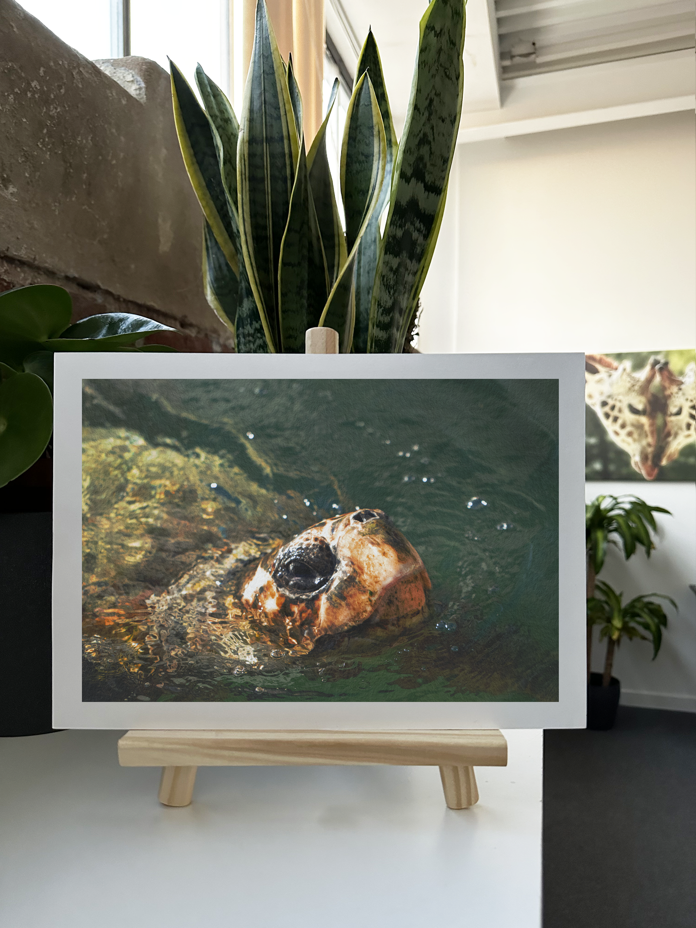 This captivating Fine Art print portrays an intimate moment of a sea turtle breaking the water's surface. The composition masterfully captures the turtle's head and part of its shell emerging from the teal depths, creating a powerful focal point that draws the viewer into the marine world.