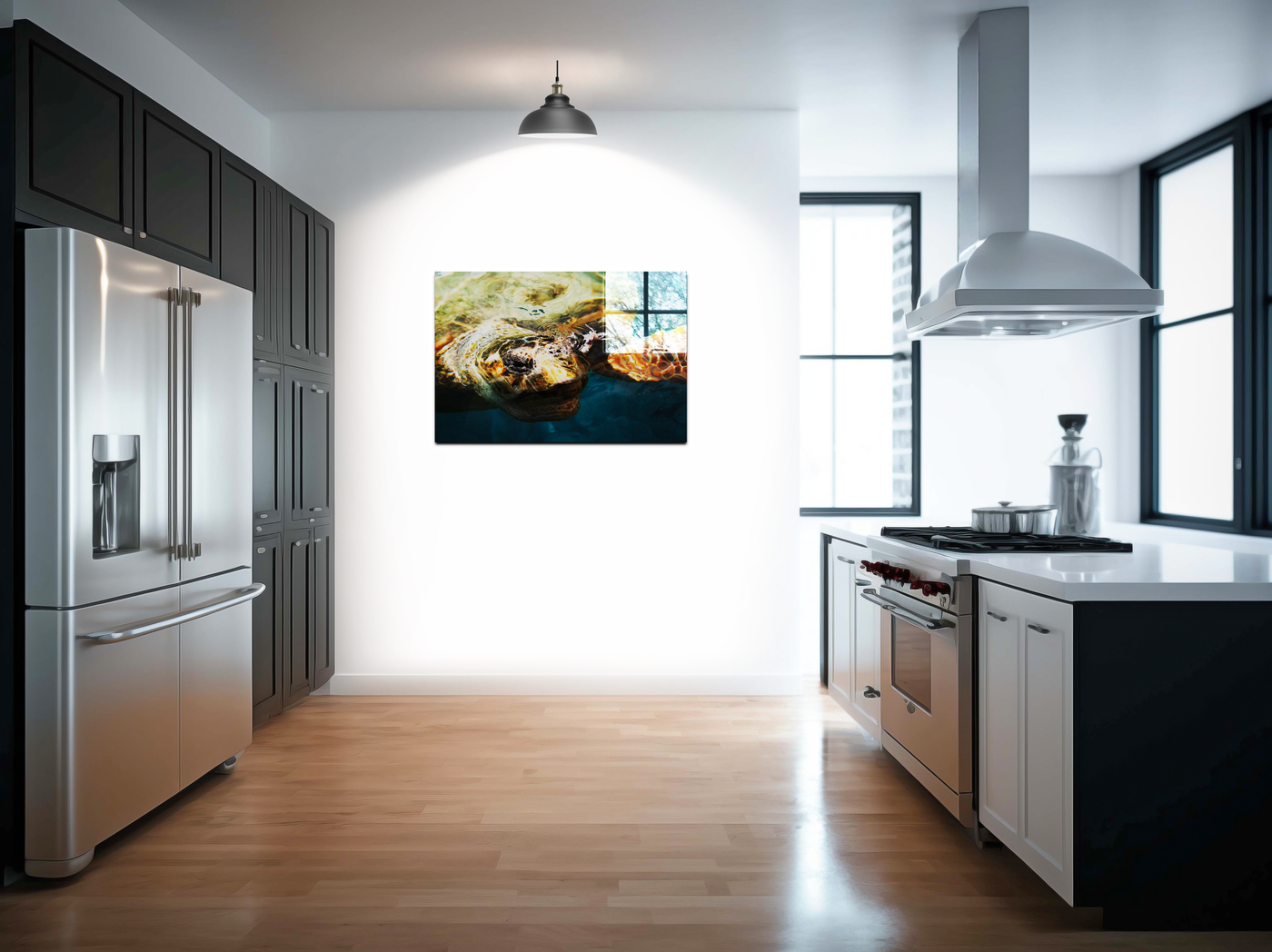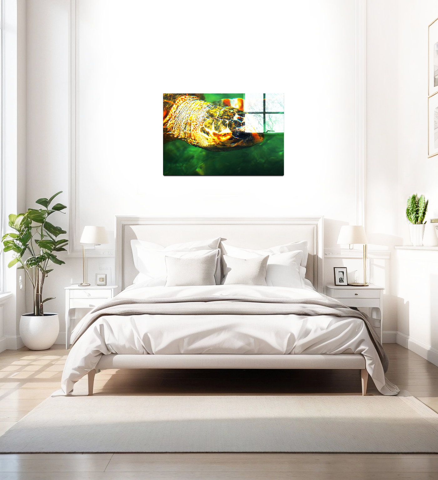 The high-gloss finish of the Acrylic enhances the perception of being underwater, giving the colours an almost luminous quality. The clarity of the medium perfectly captures the crisp details of the turtle's features while simultaneously enhancing the soft, dreamy quality of the surrounding water. This piece would make a dramatic statement in any interior, bringing the mysterious beauty of the ocean into your living space and inviting viewers to pause and marvel at the wonders of marine life.