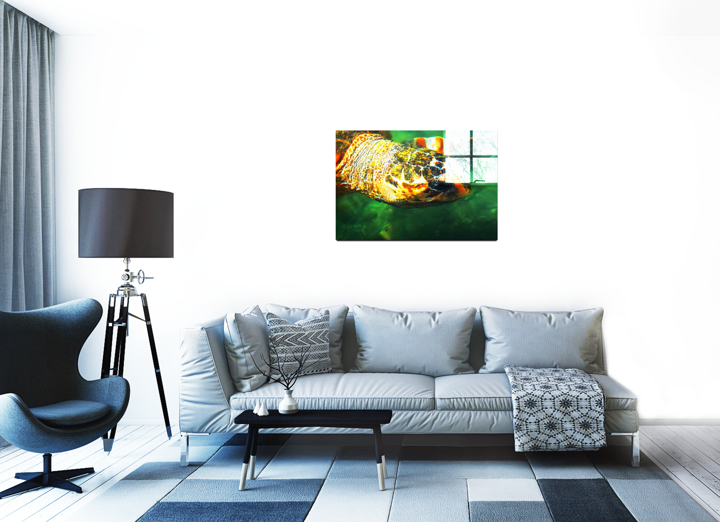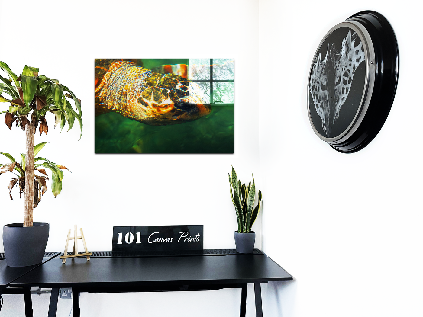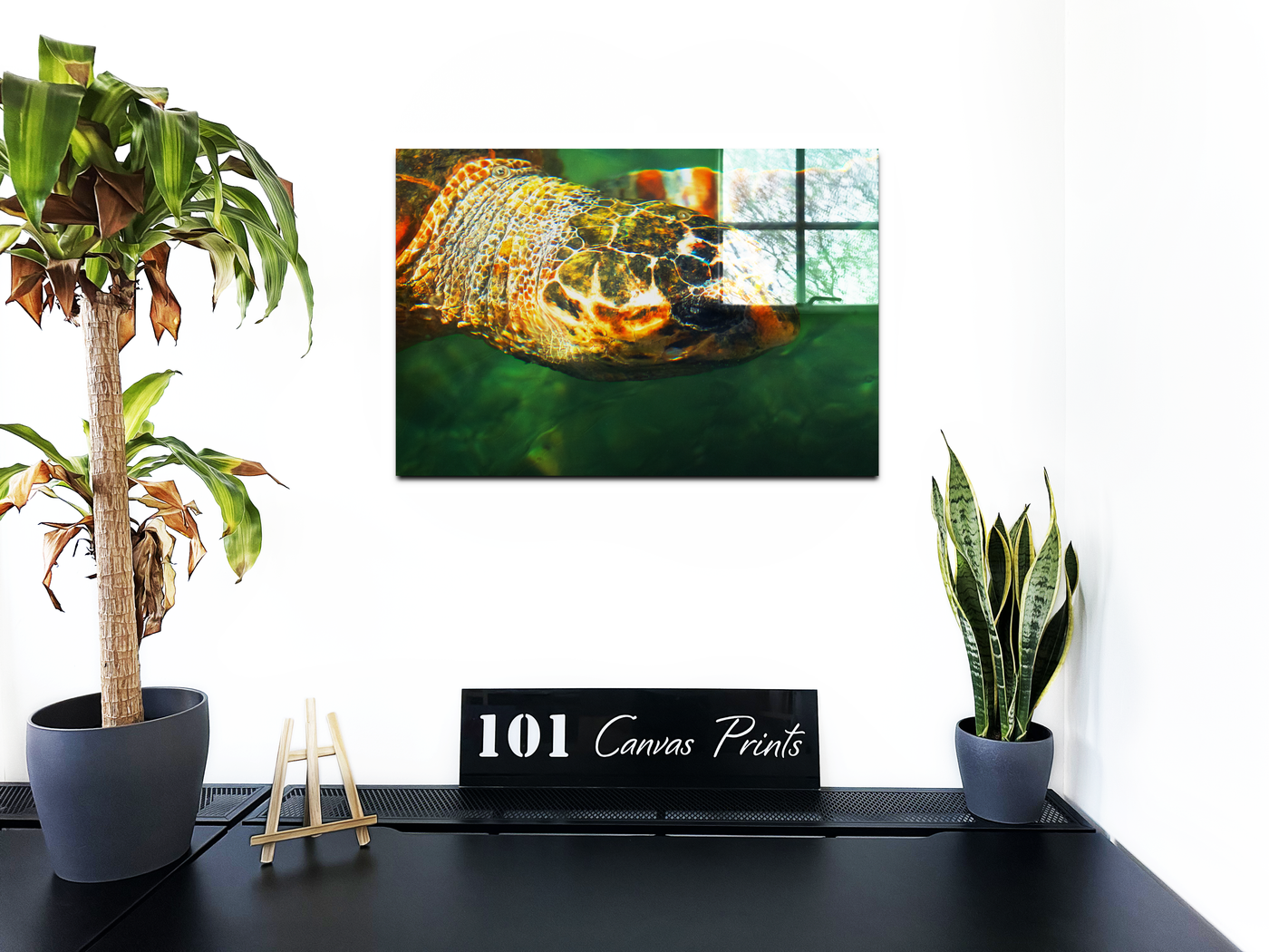 Immerse yourself in the underwater world with this stunning Acrylic print featuring a majestic sea turtle. The photograph offers an intimate view of the turtle's head and upper body as it navigates through the emerald depths. Every detail of the creature's ancient armour is captured with remarkable clarity, from the individual scales to the unique patterns adorning its shell.