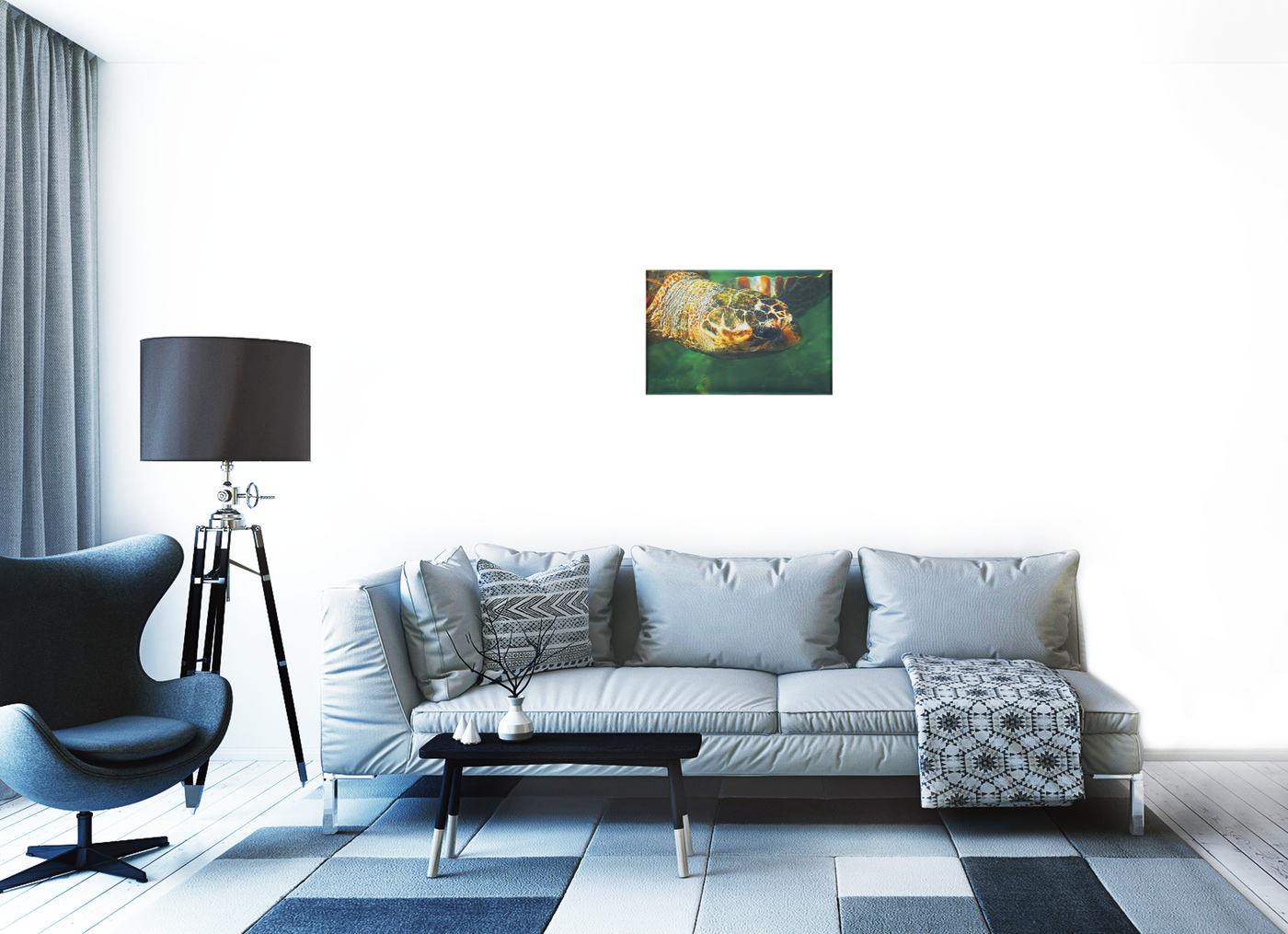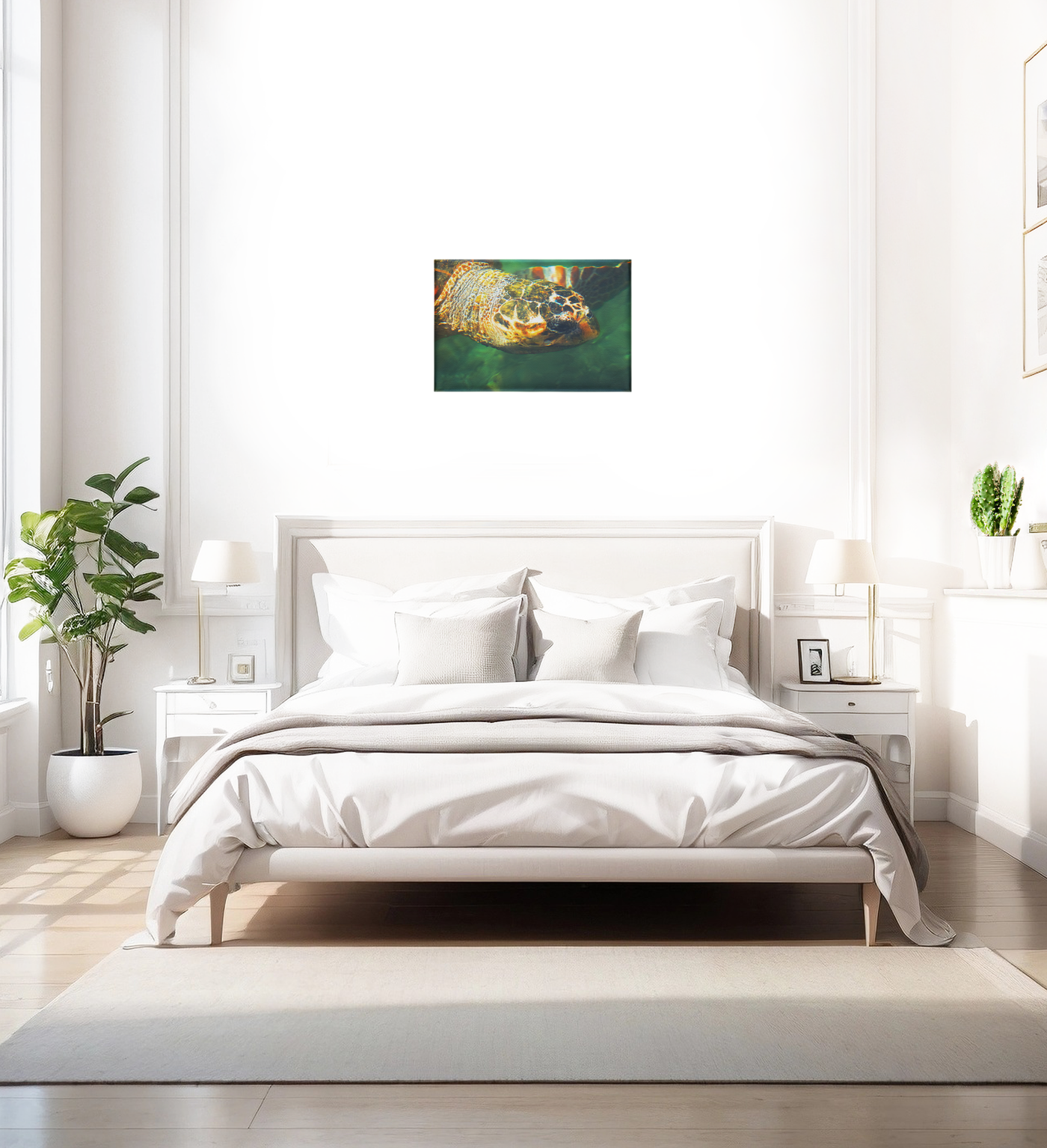 Rendered on Canvas, this print takes on a textural quality that enhances the natural subject matter. The subtle weave of the Canvas complements the intricate patterns of the turtle's shell, adding depth to the viewing experience. This piece would bring a sense of oceanic wonder to any space, serving as a striking reminder of the beauty and complexity of marine life.
