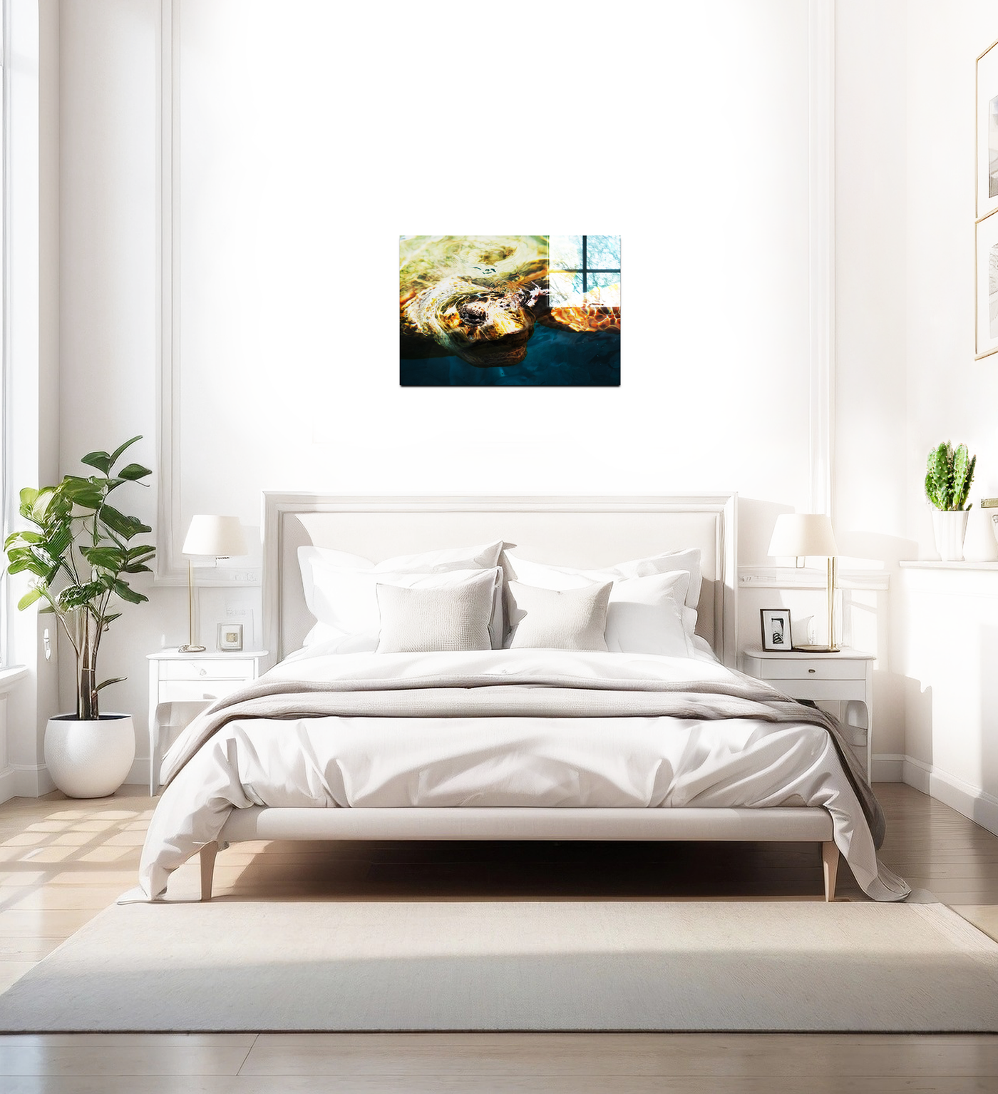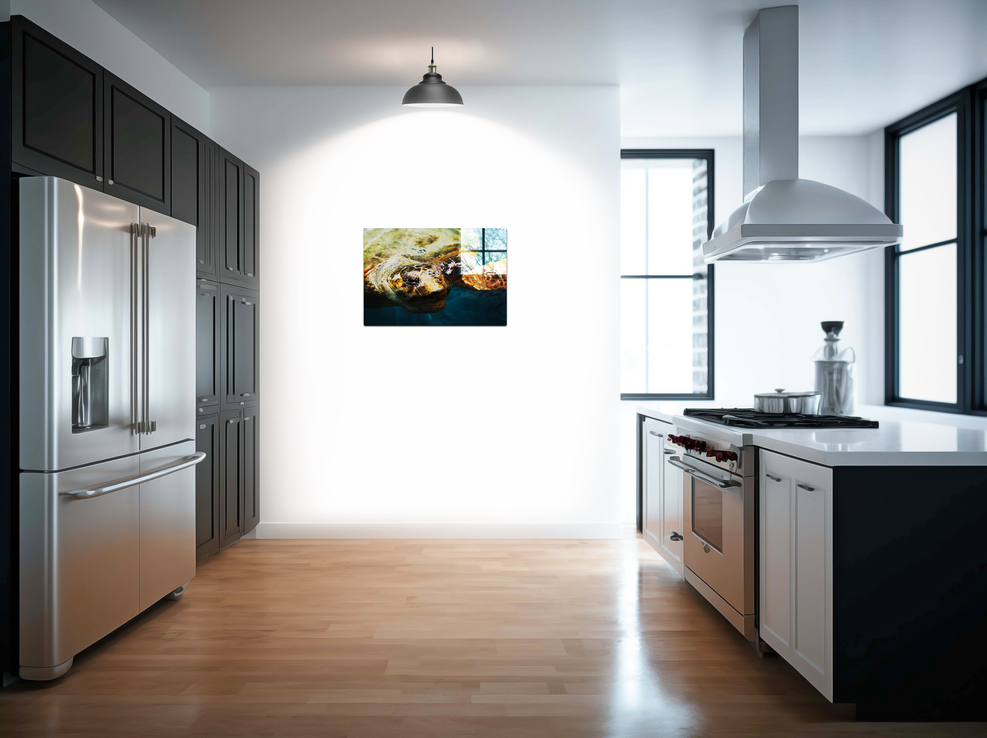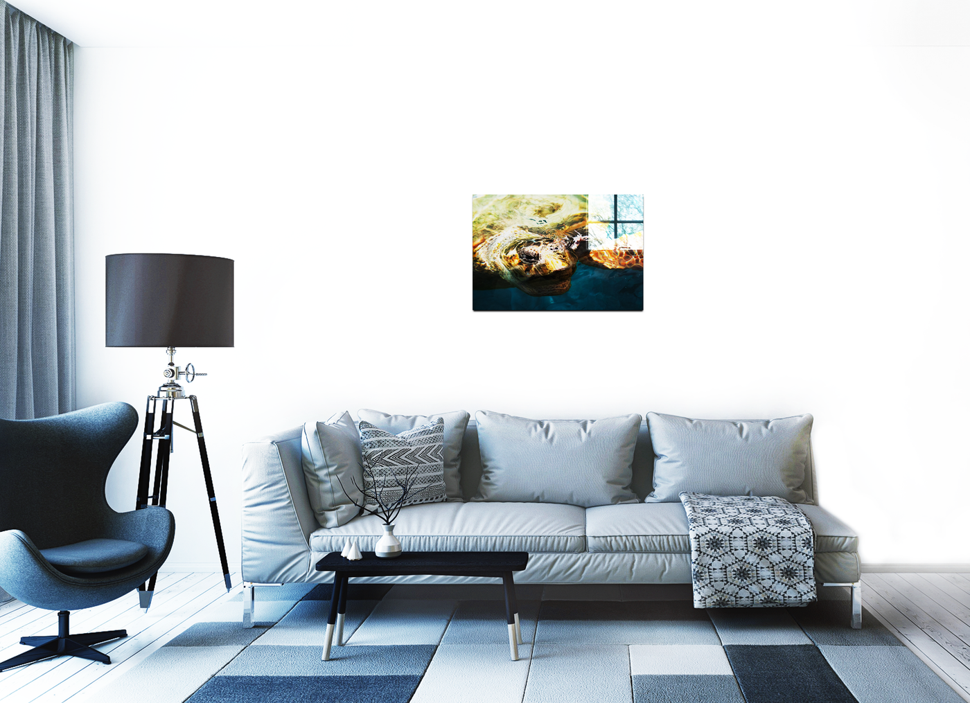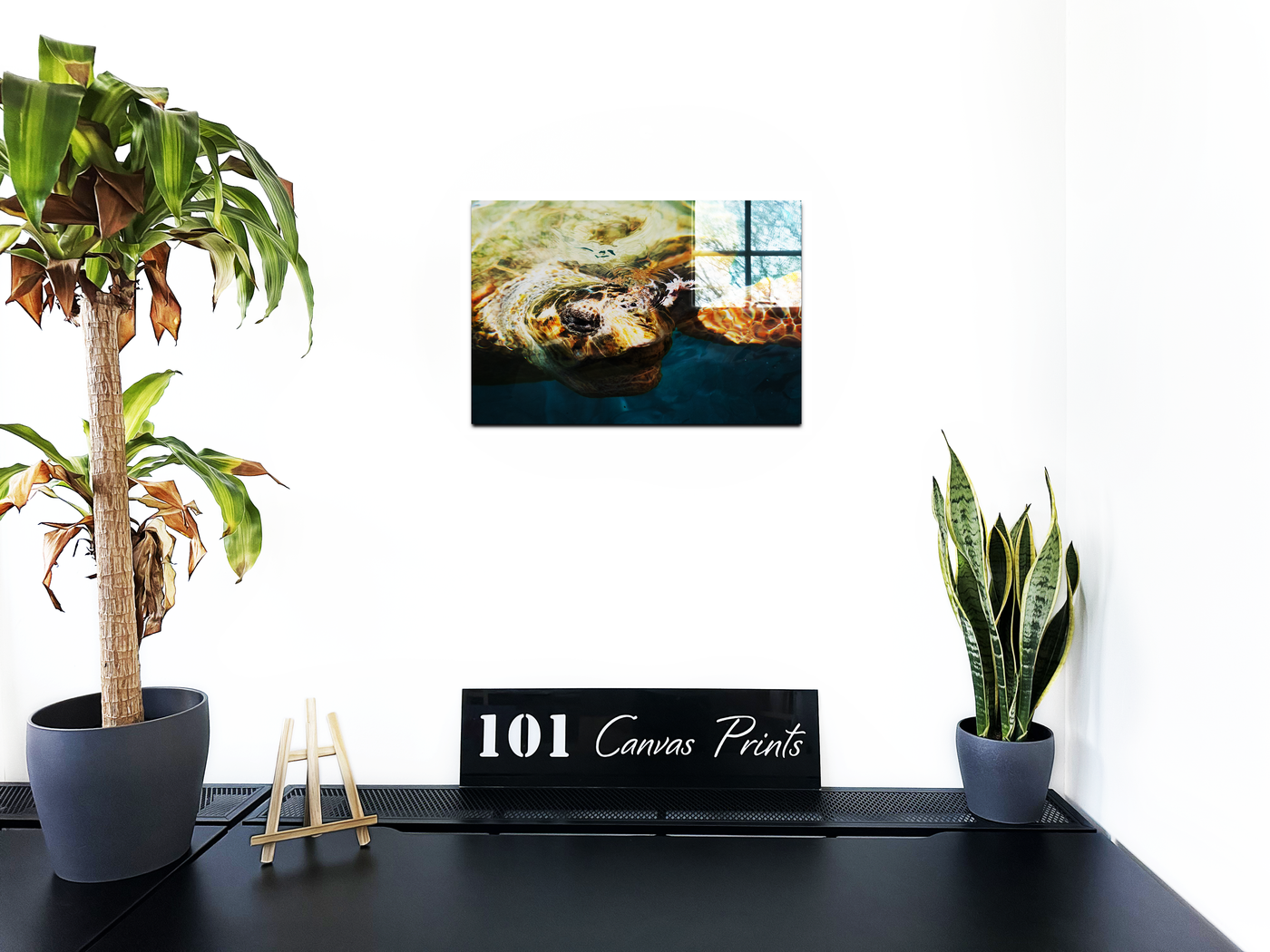 Set behind Acrylic, this image takes on an almost three-dimensional quality. The glossy finish of the Acrylic enhances the 'wet' appearance of the scene, creating a sense of depth that mirrors the watery environment. This effect makes it appear as if the turtle is truly emerging from beneath the surface, inviting the viewer to reach out and touch the cool water. The Acrylic setting also serves to intensify the colours and sharpen the details, making every scale and ripple stand out in vivid clarity. This dynamic piece would make a stunning focal point in a modern interior, particularly in spaces with contemporary décor where its vibrant colours and glossy finish can create maximum impact, bringing a slice of ocean life into any room.