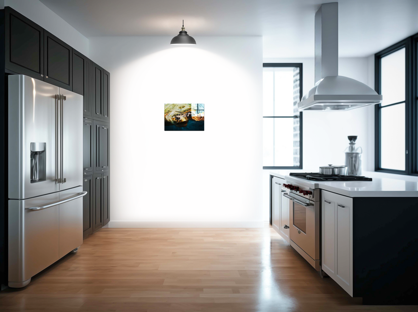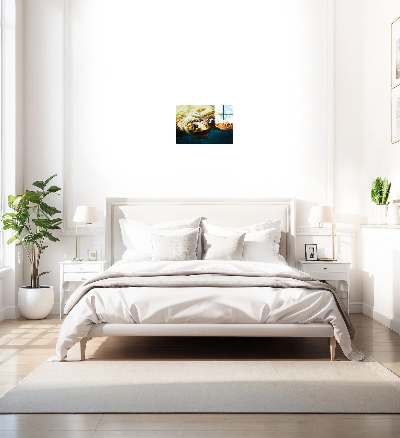 Set behind Acrylic, this image takes on an almost three-dimensional quality. The glossy finish of the Acrylic enhances the 'wet' appearance of the scene, creating a sense of depth that mirrors the watery environment. This effect makes it appear as if the turtle is truly emerging from beneath the surface, inviting the viewer to reach out and touch the cool water. The Acrylic setting also serves to intensify the colours and sharpen the details, making every scale and ripple stand out in vivid clarity. This dynamic piece would make a stunning focal point in a modern interior, particularly in spaces with contemporary décor where its vibrant colours and glossy finish can create maximum impact, bringing a slice of ocean life into any room.