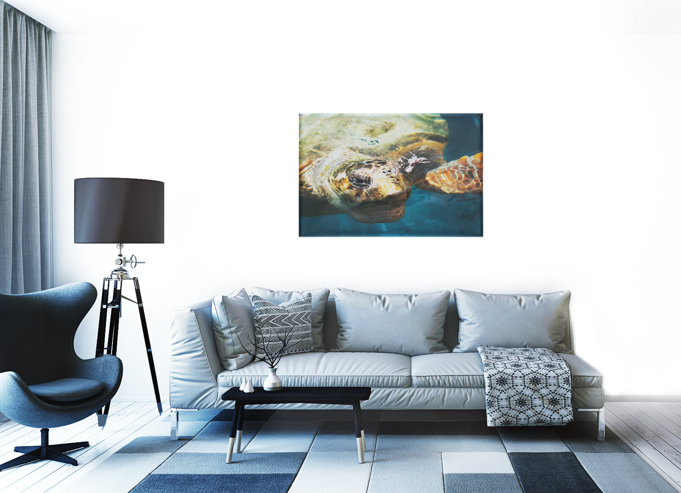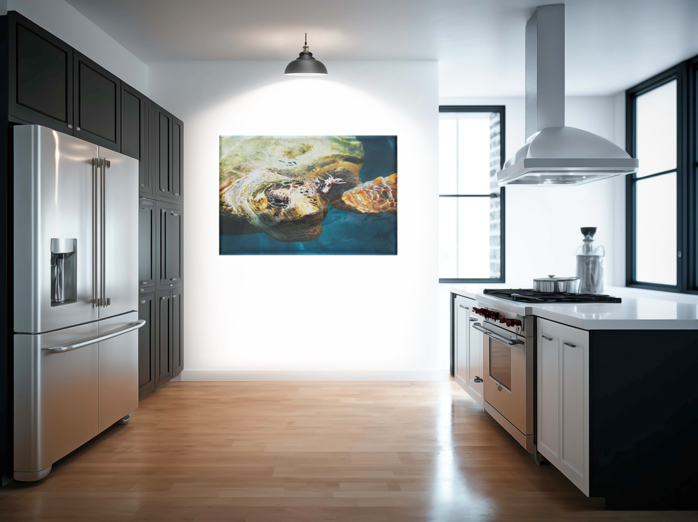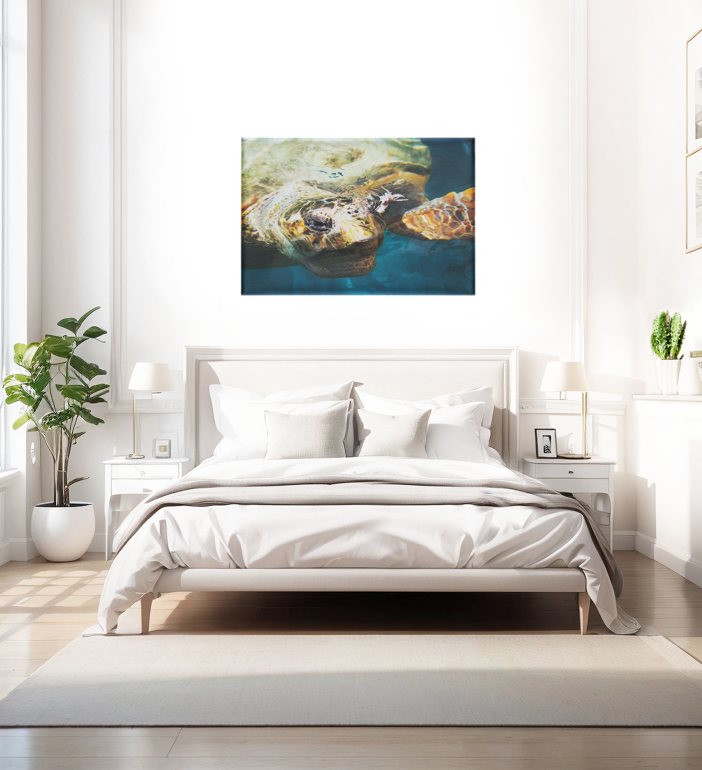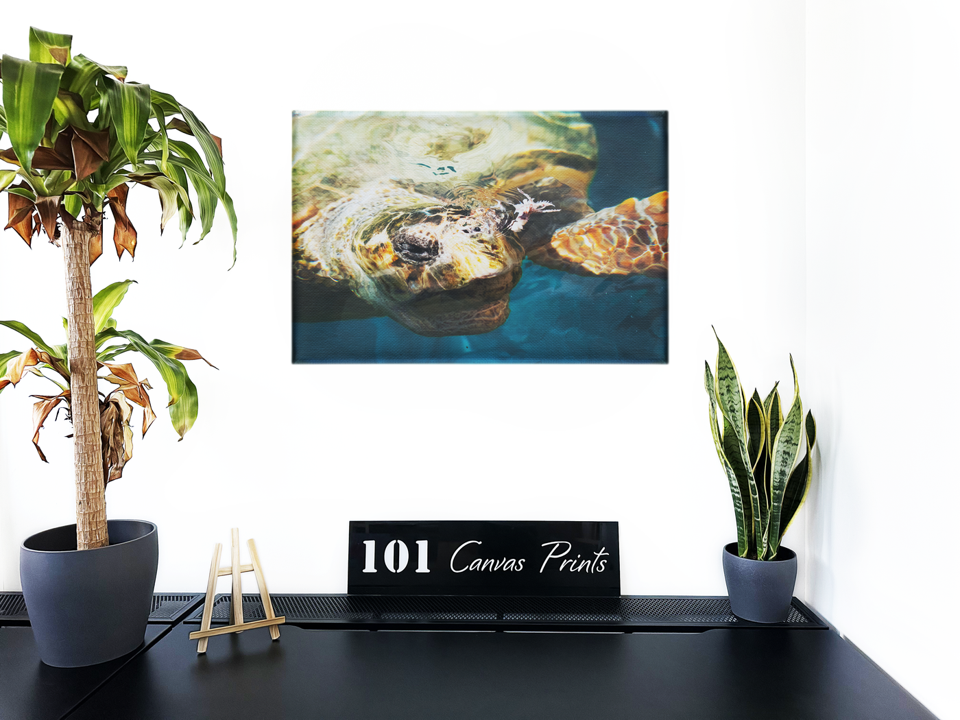 The textured surface of the Canvas enhances the natural feel of this aquatic portrait, subtly mimicking the interplay of light on water and the rough texture of the turtle's skin. Its matte finish softens the overall effect, creating a serene atmosphere that invites contemplation. This piece would be a perfect addition to a coastal-themed room, a nature lover's study, or any space where the calming presence of marine life is desired.