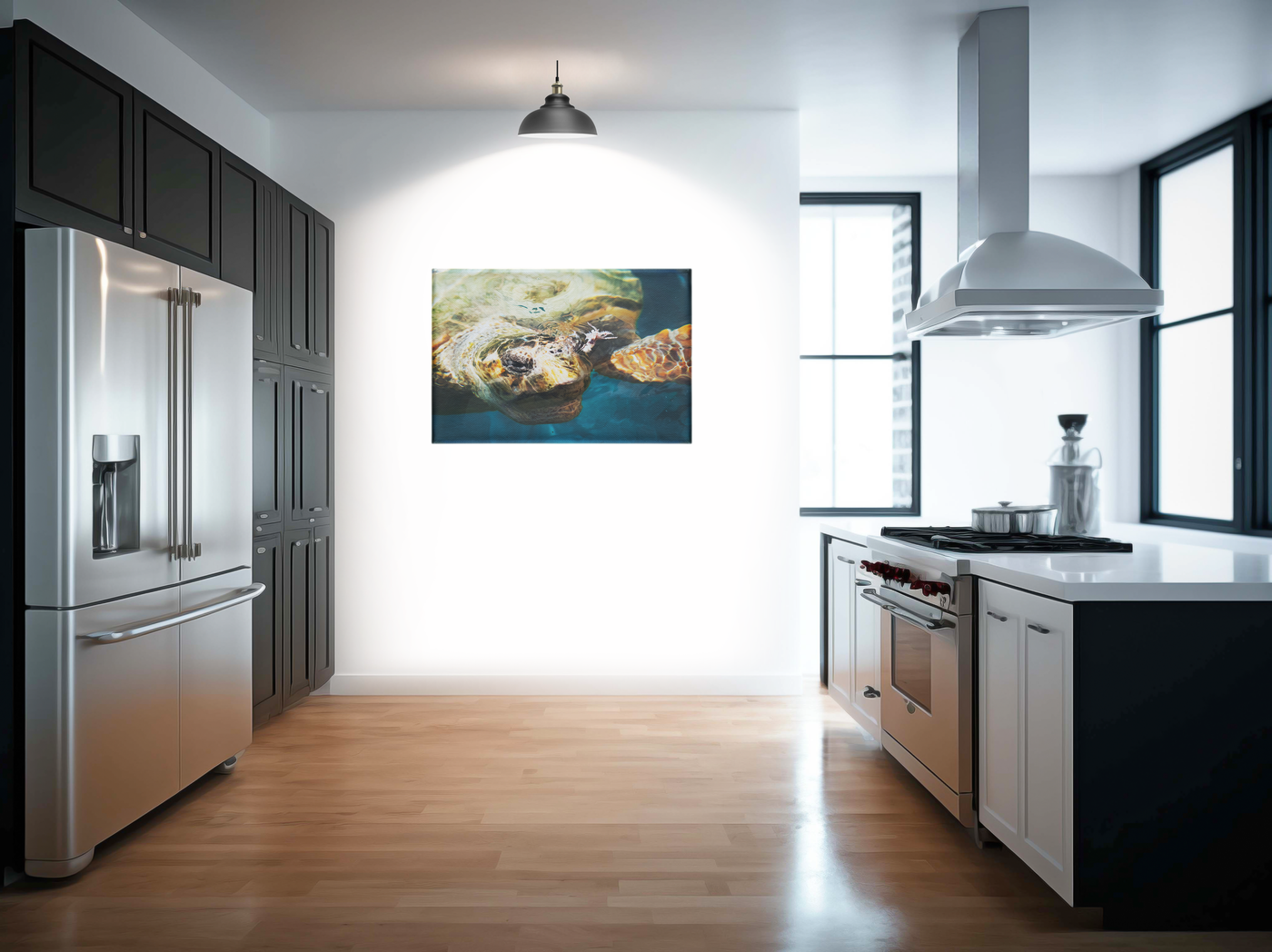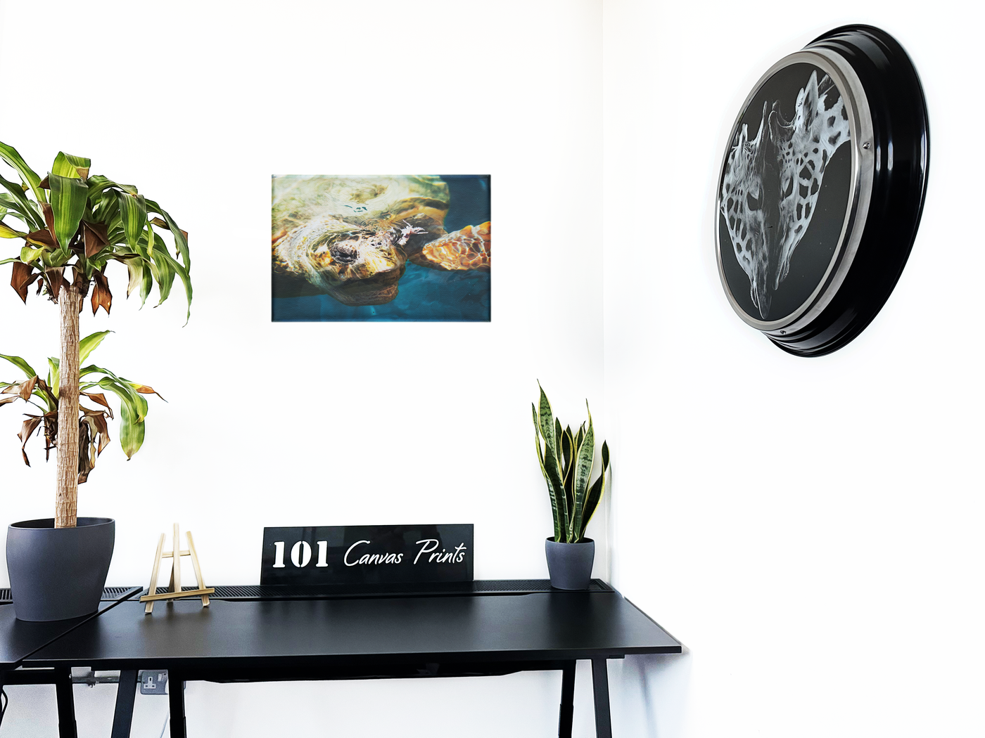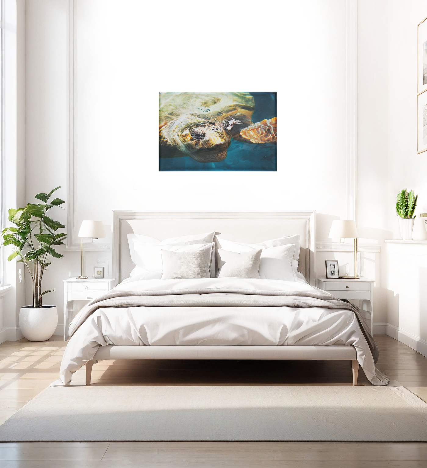 The textured surface of the Canvas enhances the natural feel of this aquatic portrait, subtly mimicking the interplay of light on water and the rough texture of the turtle's skin. Its matte finish softens the overall effect, creating a serene atmosphere that invites contemplation. This piece would be a perfect addition to a coastal-themed room, a nature lover's study, or any space where the calming presence of marine life is desired.
