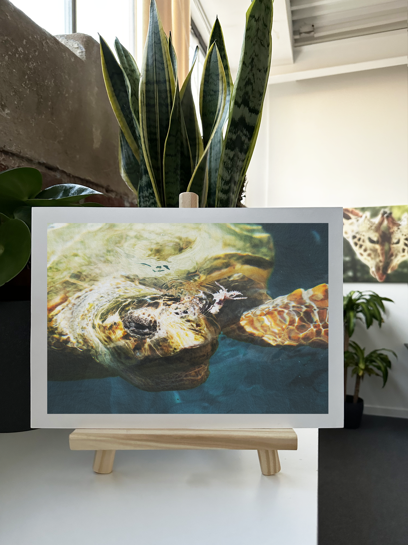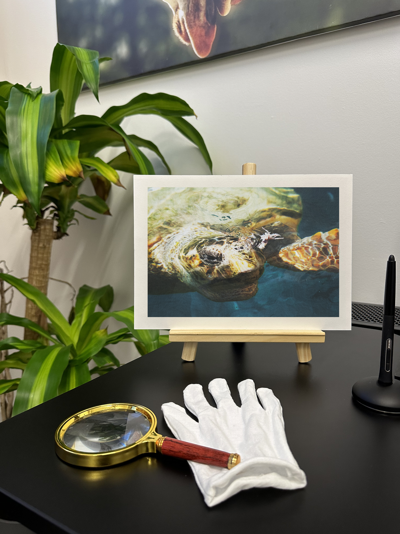 The textured surface of the Fine Art paper enhances the natural feel of this aquatic portrait, subtly mimicking the interplay of light on water and the rough texture of the turtle's skin. Its matte finish softens the overall effect, creating a serene atmosphere that invites contemplation. This piece would be a perfect addition to a coastal-themed room, a nature lover's study, or any space where the calming presence of marine life is desired.