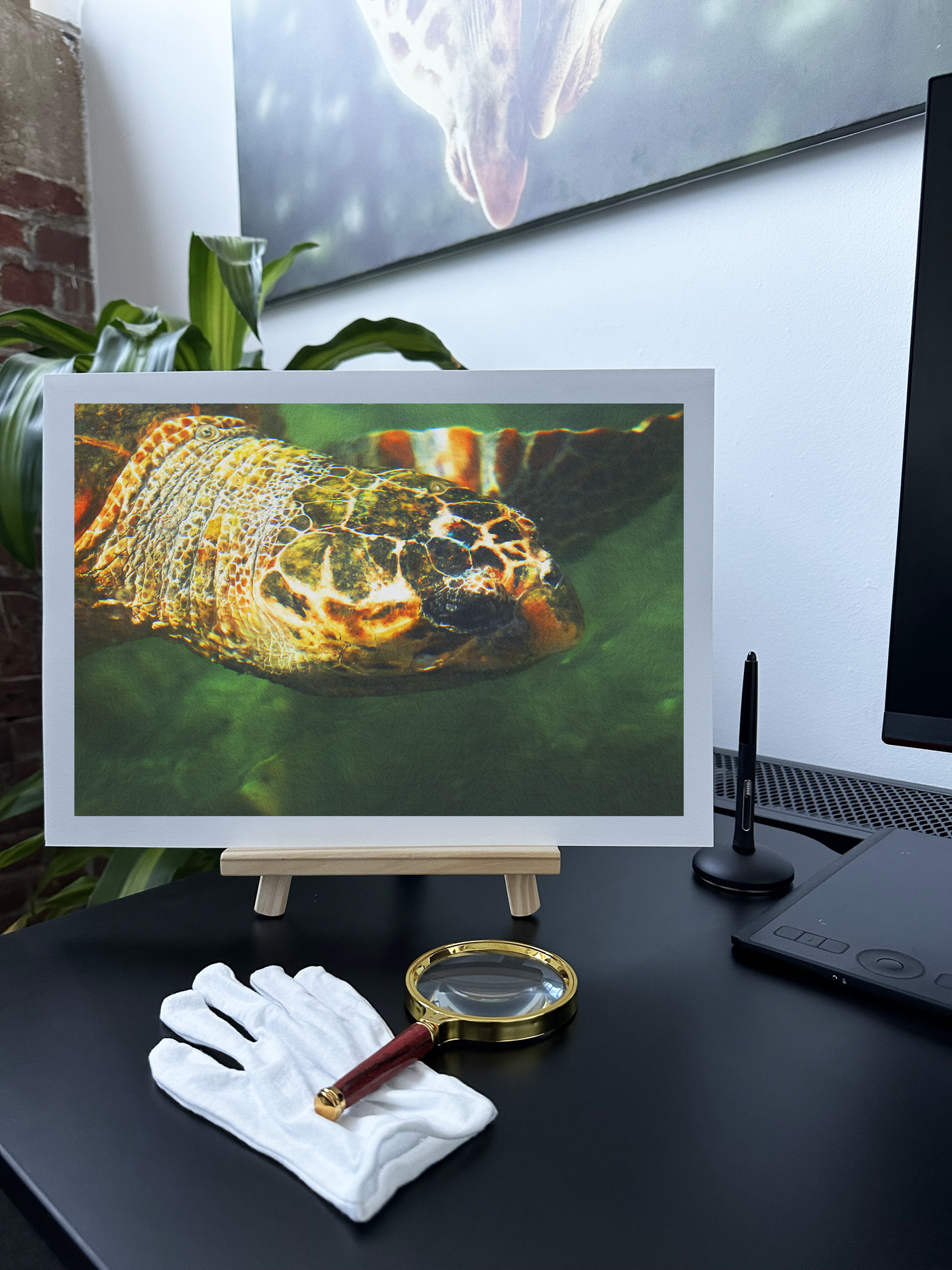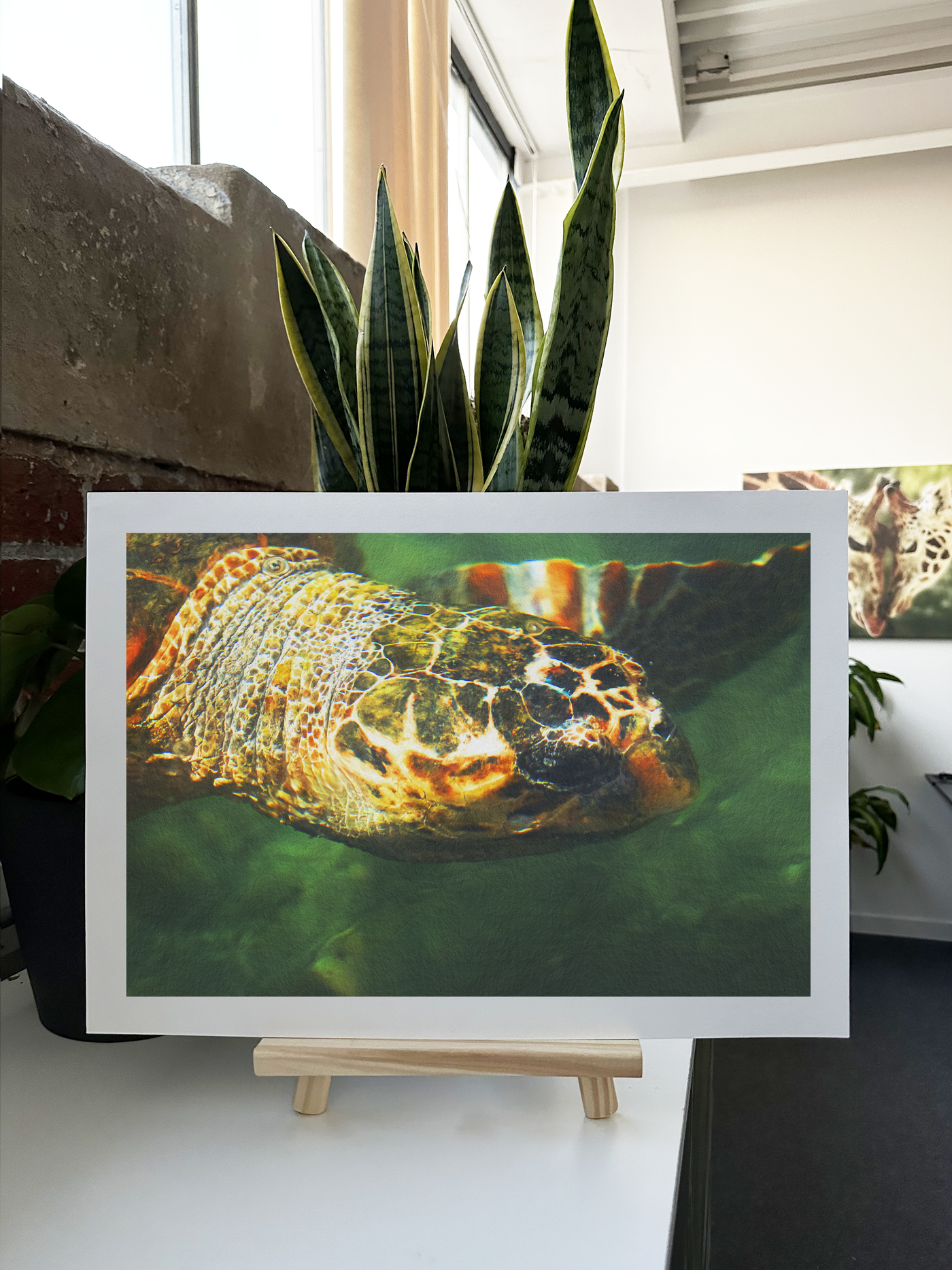 Rendered on Fine Art paper, this print takes on a textural quality that enhances the natural subject matter. The subtle Fine Art paper texture complements the intricate patterns of the turtle's shell, adding depth to the viewing experience. This piece would bring a sense of oceanic wonder to any space, serving as a striking reminder of the beauty and complexity of marine life.