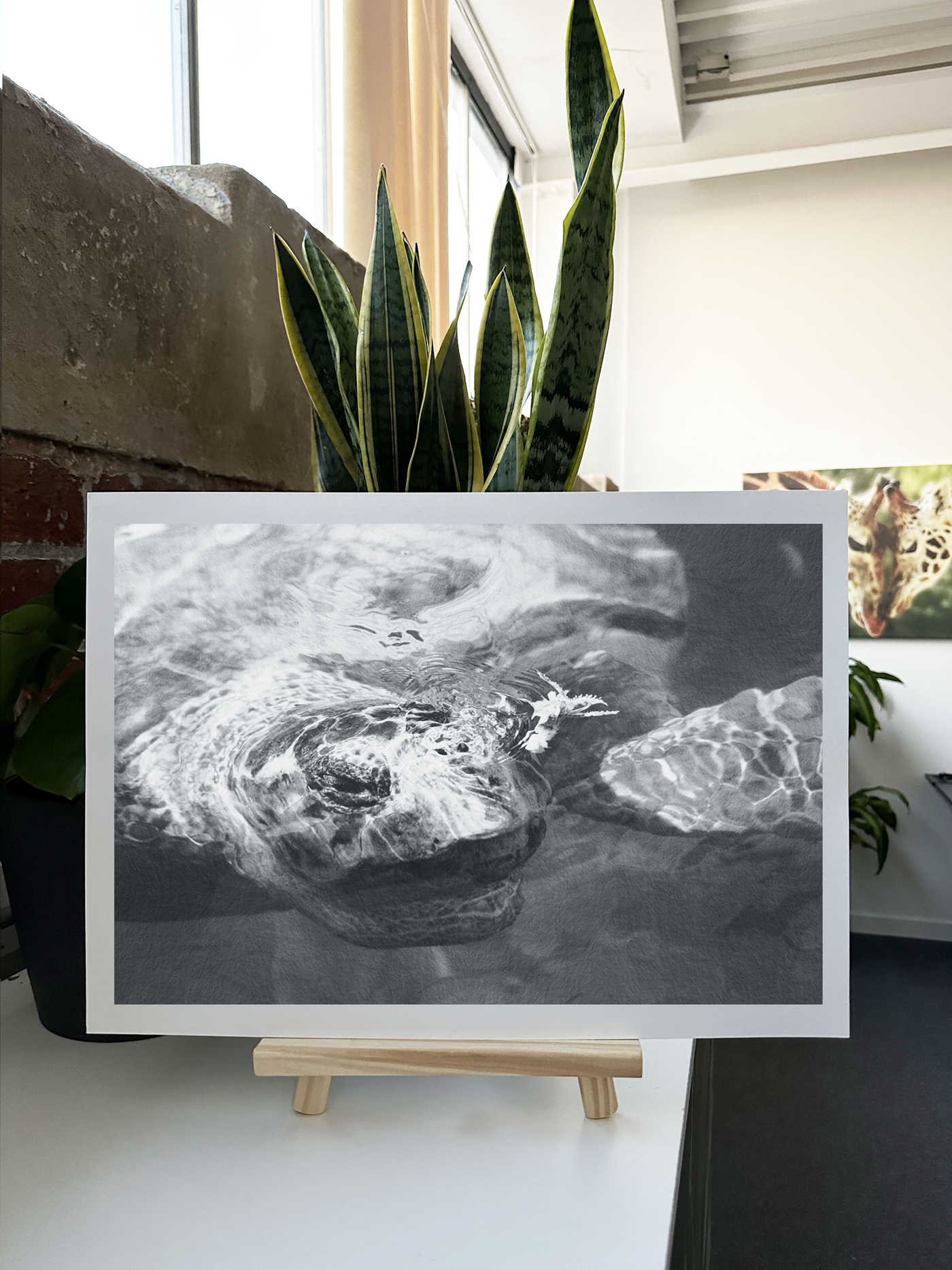 This captivating Monochrome Fine Art print freezes a fleeting moment as a sea turtle breaks the water's surface. The composition is masterfully framed, focusing on the turtle's head and part of its shell, with its eye as the central point of interest. Ripples of water create a natural frame around the subject, drawing the viewer's attention to the ancient mariner.