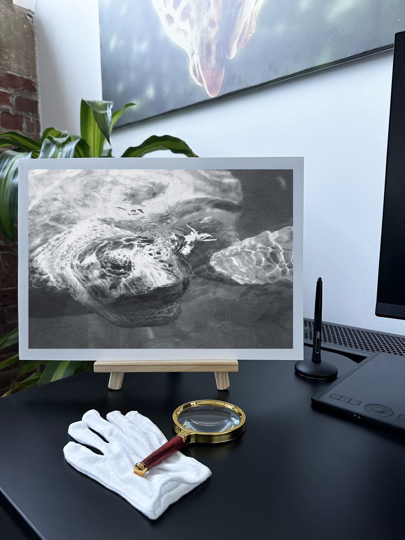 The textured surface of the Fine Art paper enhances the natural feel of this aquatic portrait, subtly mimicking the interplay of light on water and the rough texture of the turtle's skin. Its matte finish softens the overall effect, creating a serene atmosphere that invites contemplation. This piece would be a perfect addition to a coastal-themed room, a nature lover's study, or any space where the calming presence of marine life is desired.