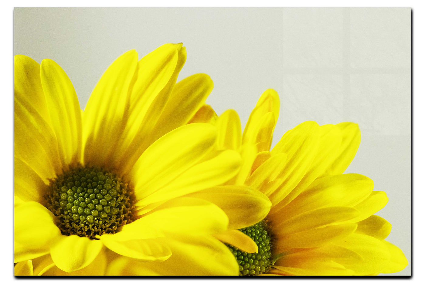 The colour scheme is a celebration of yellow in all its nuances, from the bright, almost luminous petals to the deeper, more intense hues at the flowers' centres. This golden palette is beautifully offset by the soft grey-blue of the background, creating a harmonious yet striking visual contrast. The green centres of the daisies add a touch of freshness and provide fascinating textural detail, revealing the intricate patterns found in nature.