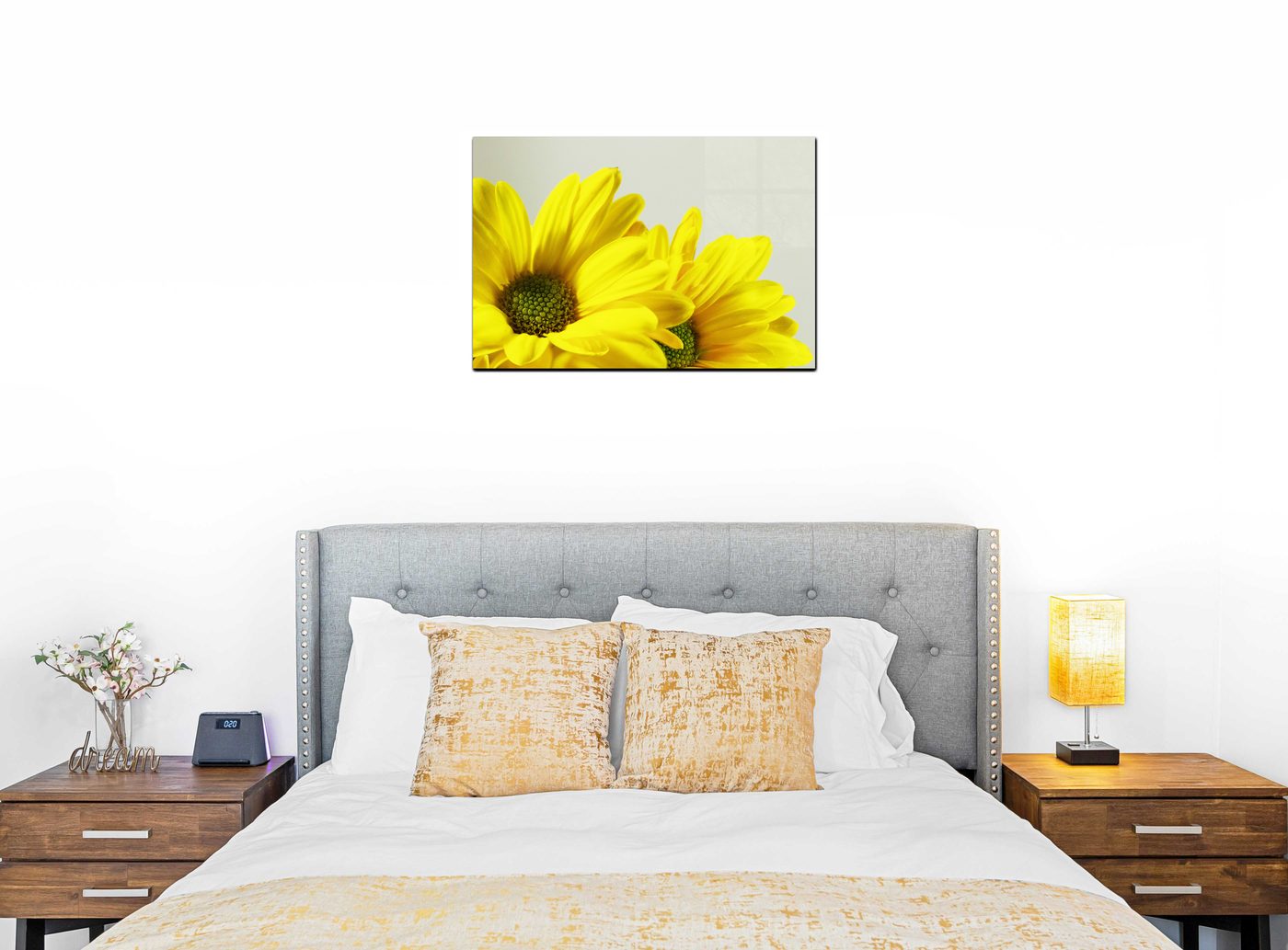 The high-gloss finish of the Acrylic enhances the luminosity of the yellow petals, making them appear to glow from within. The clarity of the medium perfectly captures the crisp details of the flowers while simultaneously enhancing the dreamy quality of the blurred background. This piece would make a bold statement in any interior, bringing the warmth and vitality of a summer's day into your living space all year round.