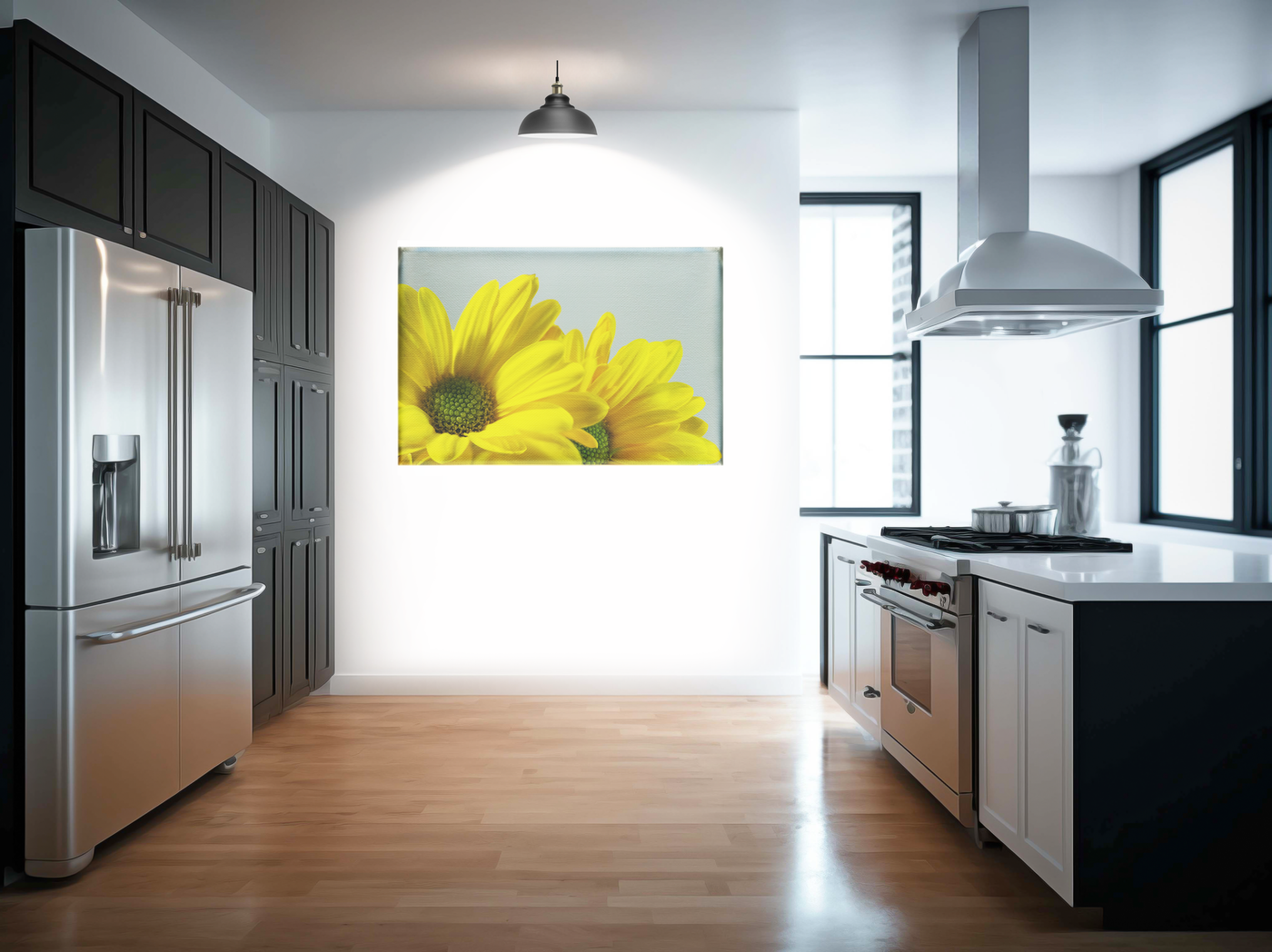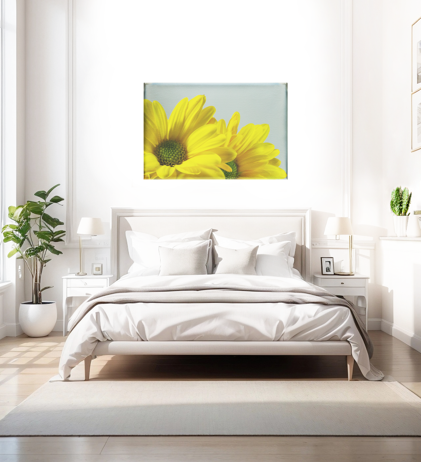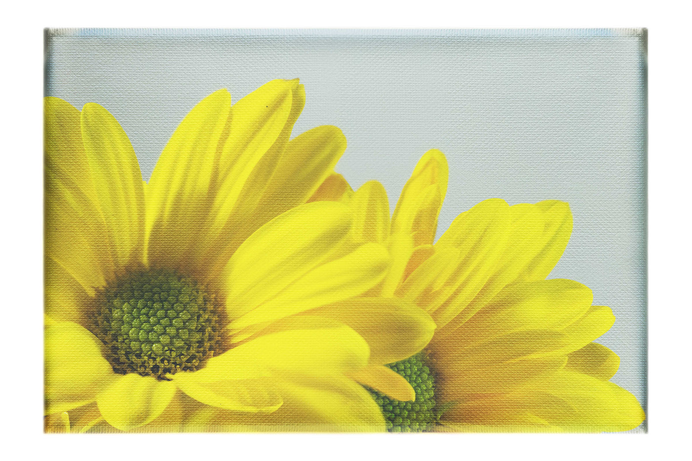 This striking Canvas Art print showcases the radiant beauty of yellow daisies in exquisite detail. The close-up composition captures two blooms, their vibrant petals stretching across the frame against a soft, muted background. The photographer's skill is evident in the perfect balance of sharp detail and gentle softness, creating a visually captivating piece.