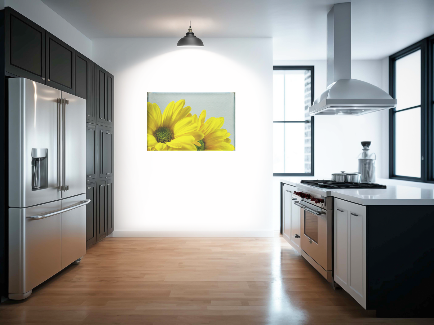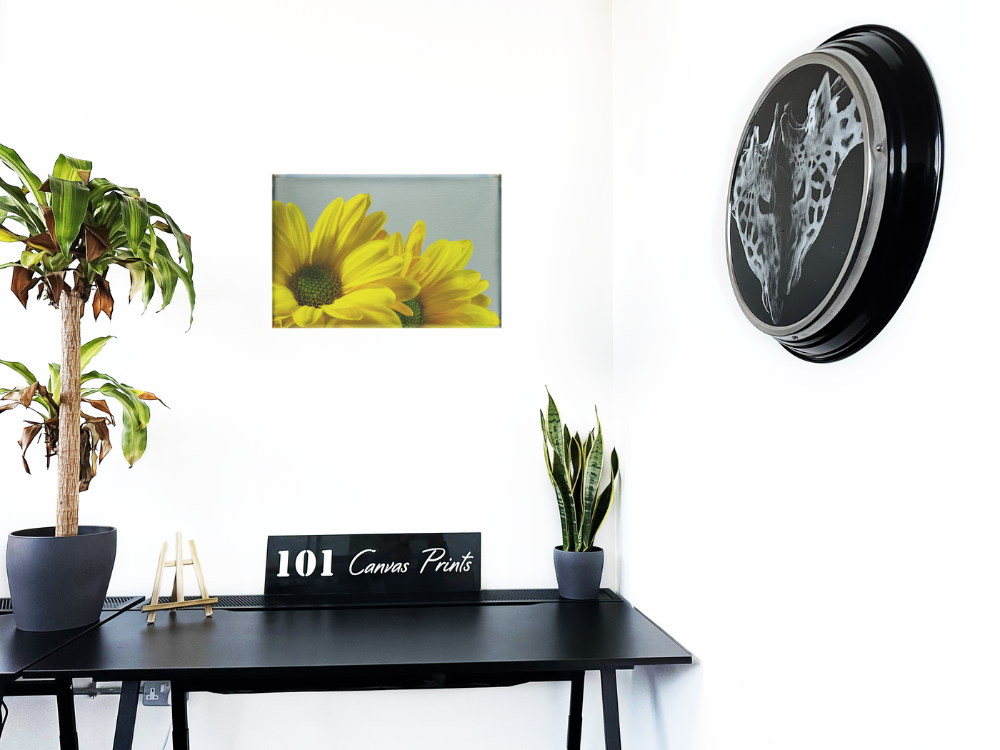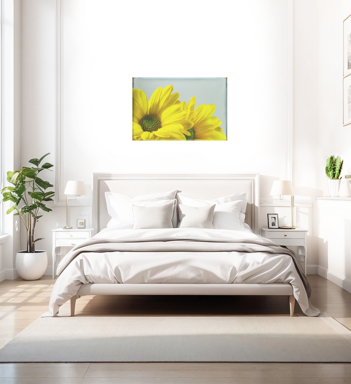 This striking Canvas Art print showcases the radiant beauty of yellow daisies in exquisite detail. The close-up composition captures two blooms, their vibrant petals stretching across the frame against a soft, muted background. The photographer's skill is evident in the perfect balance of sharp detail and gentle softness, creating a visually captivating piece.
