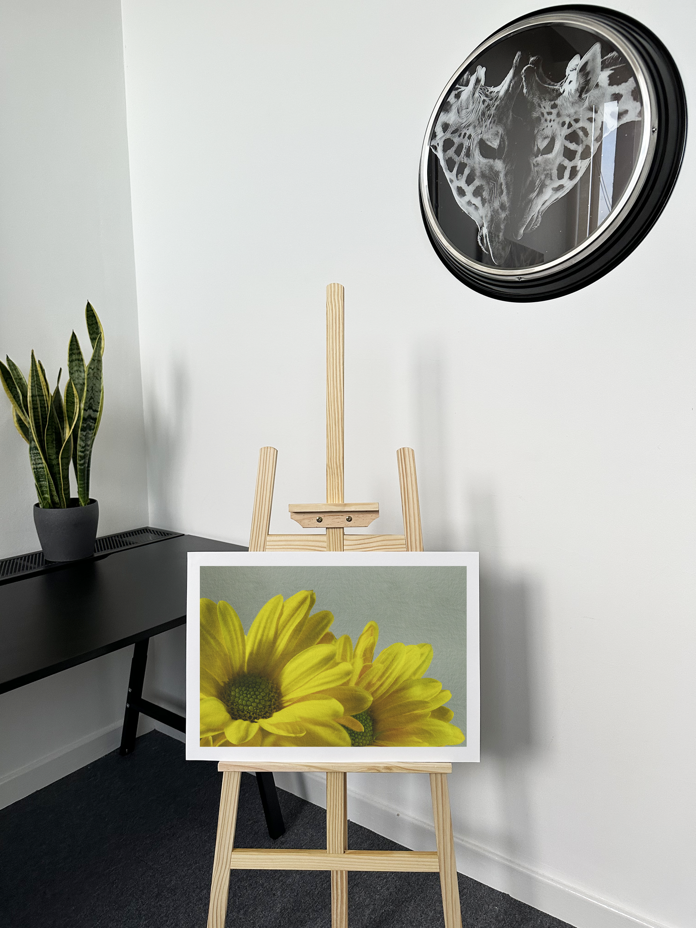Rendered on Fine Art paper, this print takes on a tactile quality that enhances the natural subject matter. The texture of the Fine Art print complements the delicate striations visible on the flower petals, adding an extra dimension to the viewing experience. This piece would bring a burst of sunshine and positivity to any room, making it an ideal choice for spaces where you want to create an uplifting, cheerful atmosphere.