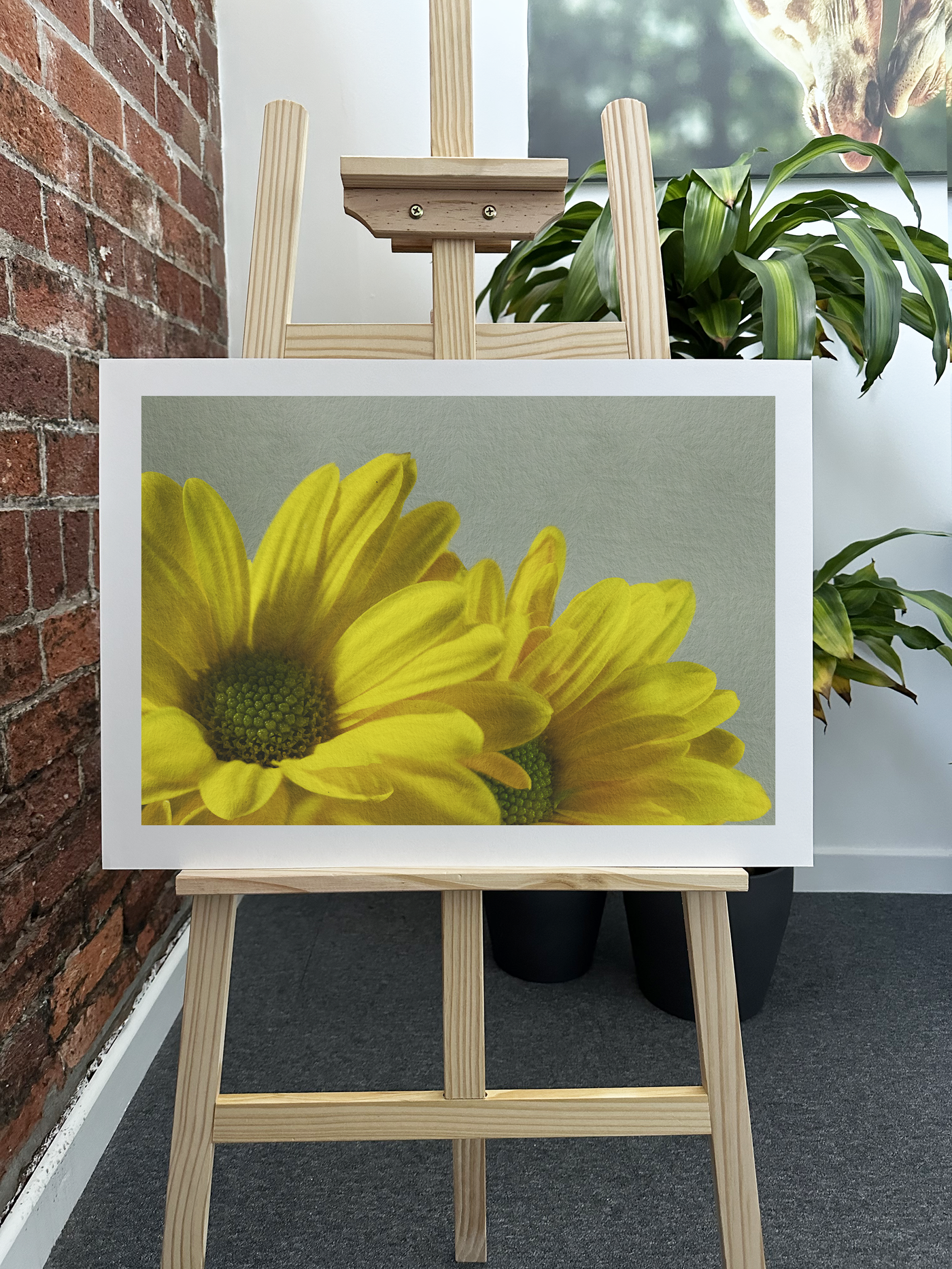 This striking Fine Art print showcases the radiant beauty of yellow daisies in exquisite detail. The close-up composition captures two blooms, their vibrant petals stretching across the frame against a soft, muted background. The photographer's skill is evident in the perfect balance of sharp detail and gentle softness, creating a visually captivating piece.