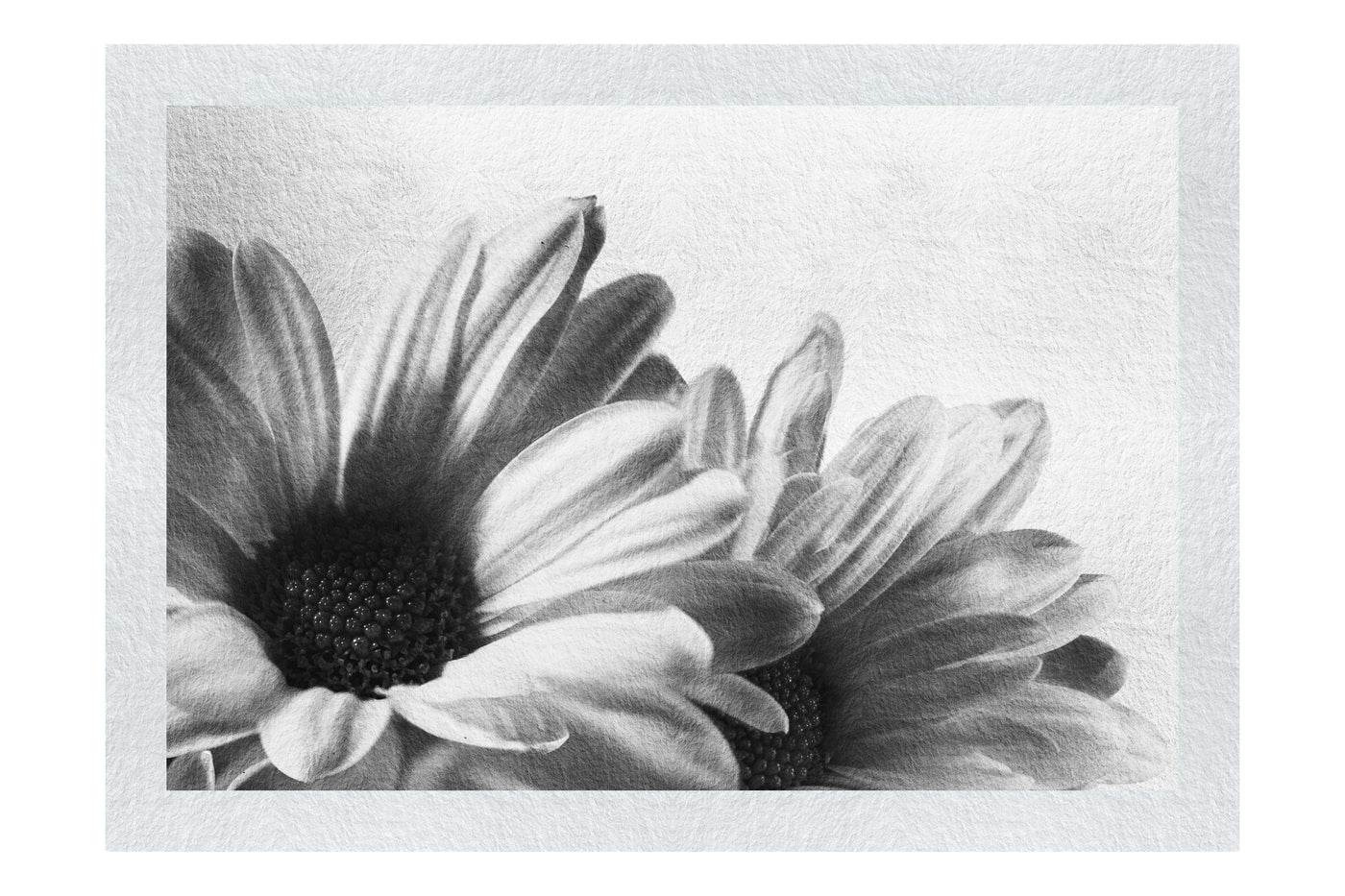 The Monochromatic palette is dominated by the sunny, cheerful silvery tones of the flowers, which stands in beautiful contrast to the subtle grey backdrop. This interplay of warm and cool tones adds depth and interest to the image. The grey centres of the daisies provide a natural focal point, their intricate texture drawing the viewer's eye and showcasing the complexity of these seemingly simple flowers.