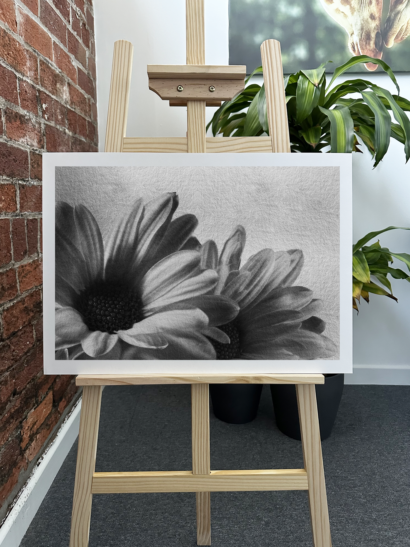 This striking Monochrome Fine Art print showcases the radiant beauty of black & white daisies in exquisite detail. The close-up composition captures two blooms, their vibrant petals stretching across the frame against a soft, muted background. The photographer's skill is evident in the perfect balance of sharp detail and gentle softness, creating a visually captivating piece.
