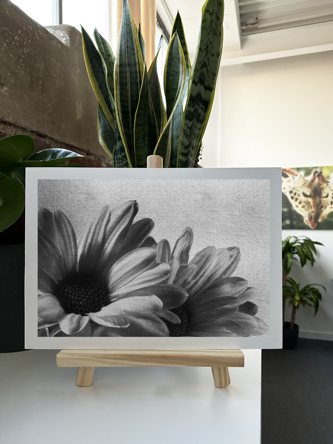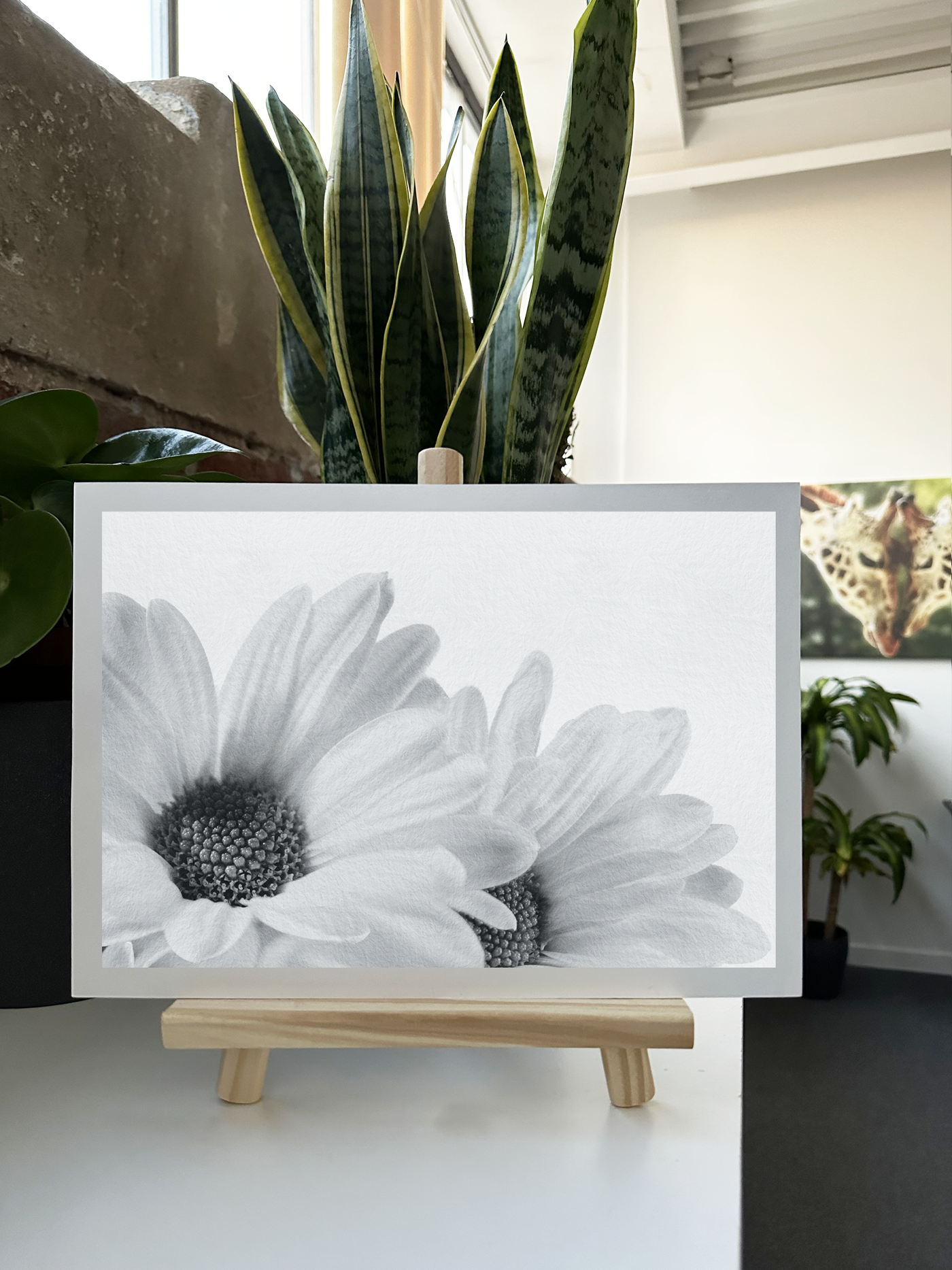 The Monochromatic palette is dominated by the sunny, cheerful silvery tones of the flowers, which stands in beautiful contrast to the subtle grey backdrop. This interplay of warm and cool tones adds depth and interest to the image. The grey centres of the daisies provide a natural focal point, their intricate texture drawing the viewer's eye and showcasing the complexity of these seemingly simple flowers.