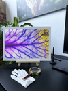 The colour palette is a vibrant explosion of purples, violets, and yellows, creating a surreal and otherworldly effect. The deep purple of the main vein gradually transitions into softer lavender hues, while the edges of the leaf burst into a vivid yellow. This interplay of colours creates a sense of depth and dimensionality, highlighting the leaf's delicate structure. The lighting appears to come from behind the leaf, giving it an almost translucent quality and emphasising the intricate network of veins.