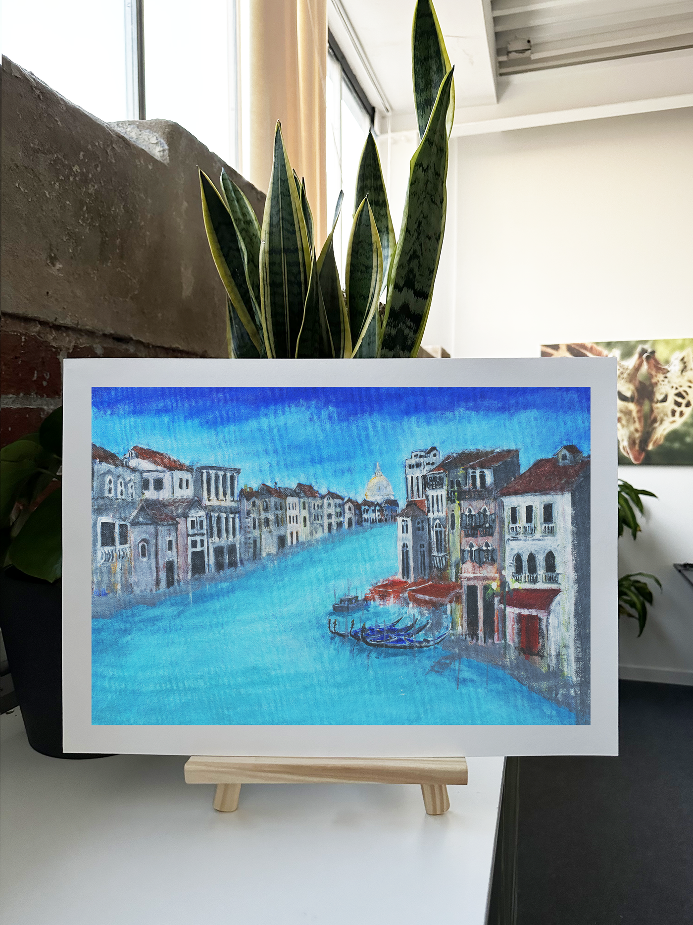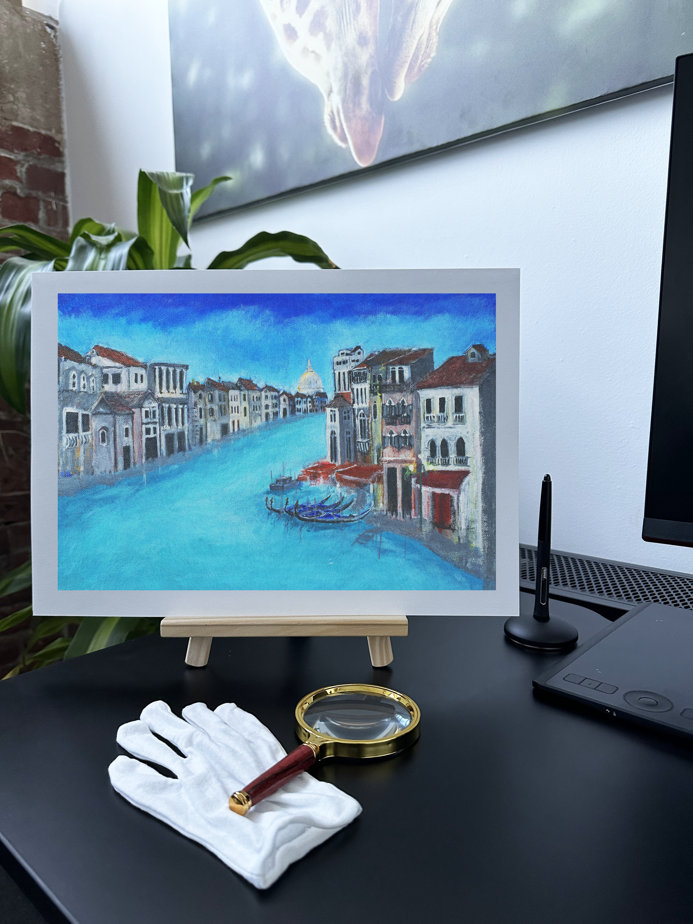 The colour palette is dominated by an otherworldly turquoise that seems to float between water and sky, creating an almost dreamlike atmosphere. The buildings in muted greys and whites, accented by terracotta roofs, stand like ghostly sentinels along the waterway. Our print enhancement team have preserved every nuance of the artist's technique, from the delicate architectural details to the luminous quality of the water that seems to glow with an inner light in the absence of the usual water traffic.