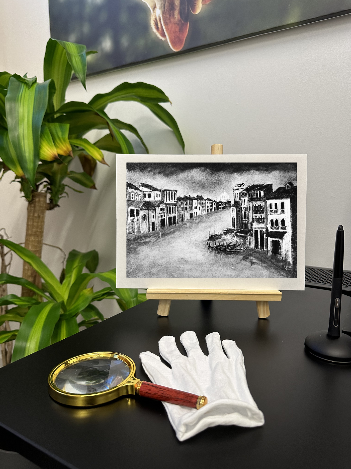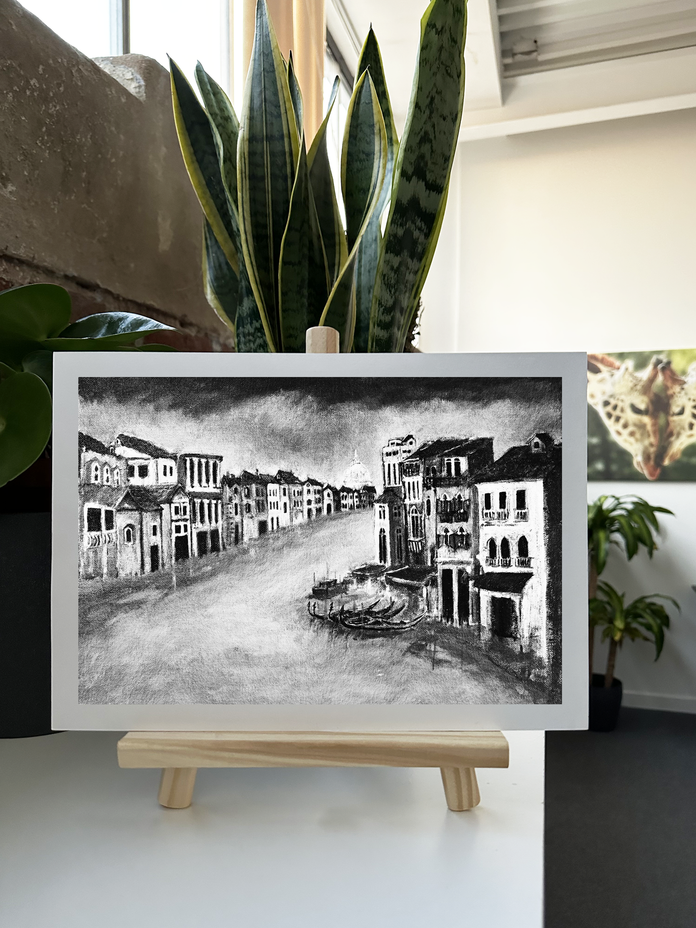 The Monochrome palette is dominated by an otherworldly silver tonality that seems to float between water and sky, creating an almost dreamlike atmosphere. The buildings in muted greys and whites, accented by terracotta roofs, stand like ghostly sentinels along the waterway. Our print enhancement team have preserved every nuance of the artist's technique, from the delicate architectural details to the luminous quality of the water that seems to glow with an inner light in the absence of the usual water traffic.