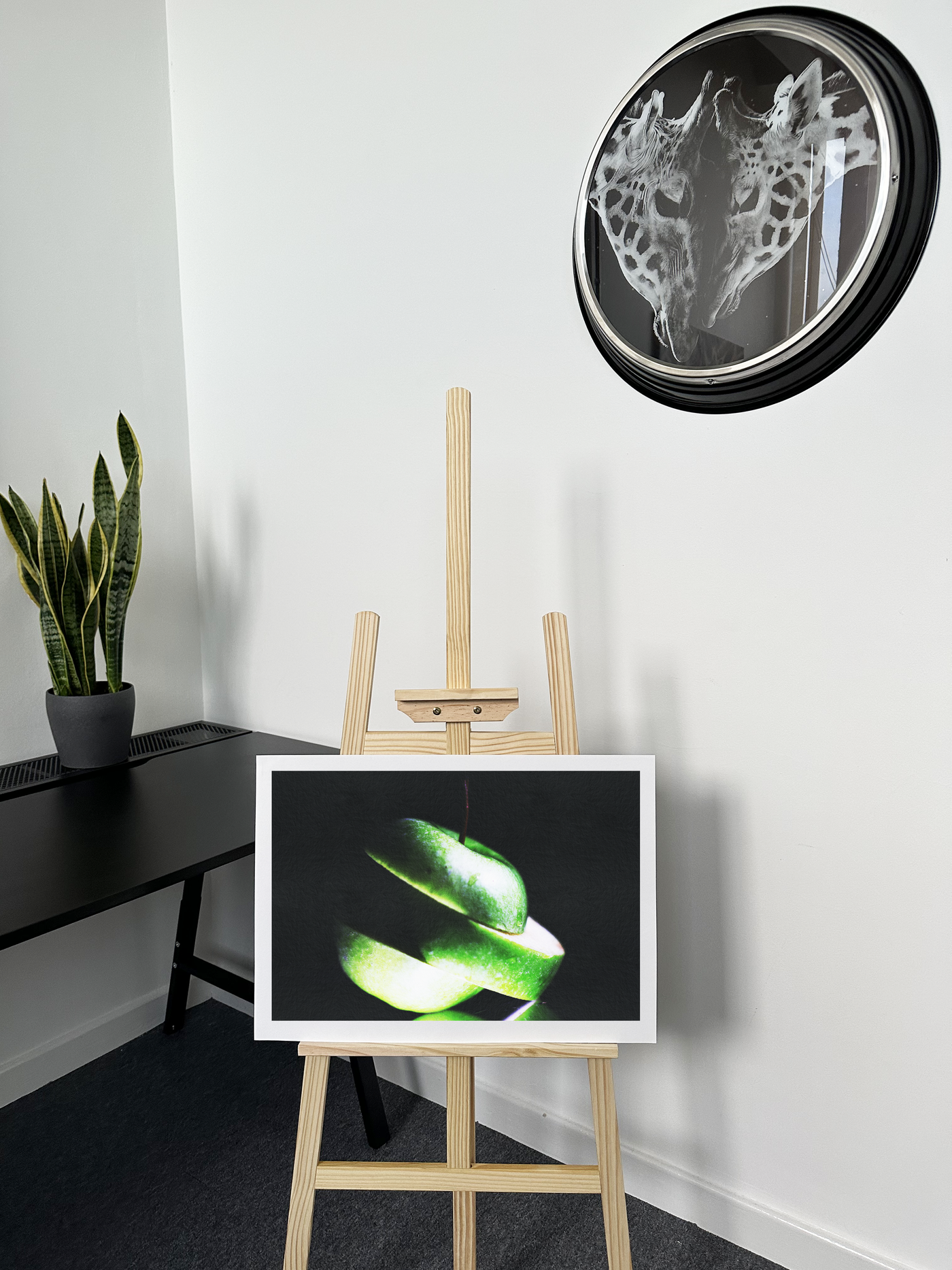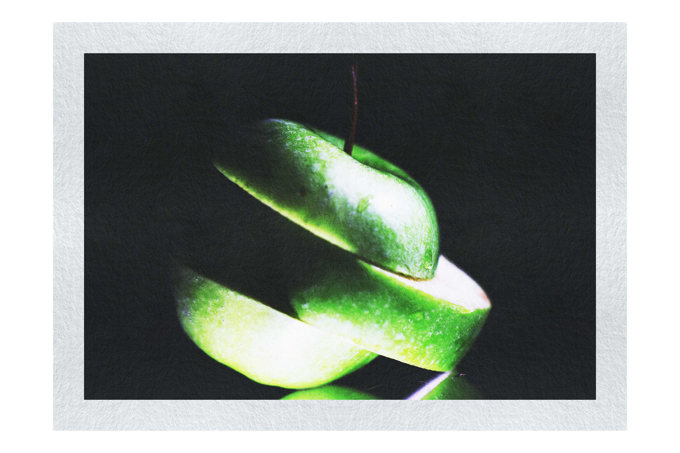 This striking Fine Art print captures the essence of simplicity and freshness in a boldly minimalist style. The photograph showcases a vibrant green apple, artfully sliced to create an elegant spiral against a deep black background. The contrast is stark and compelling, drawing the eye immediately to the subject.