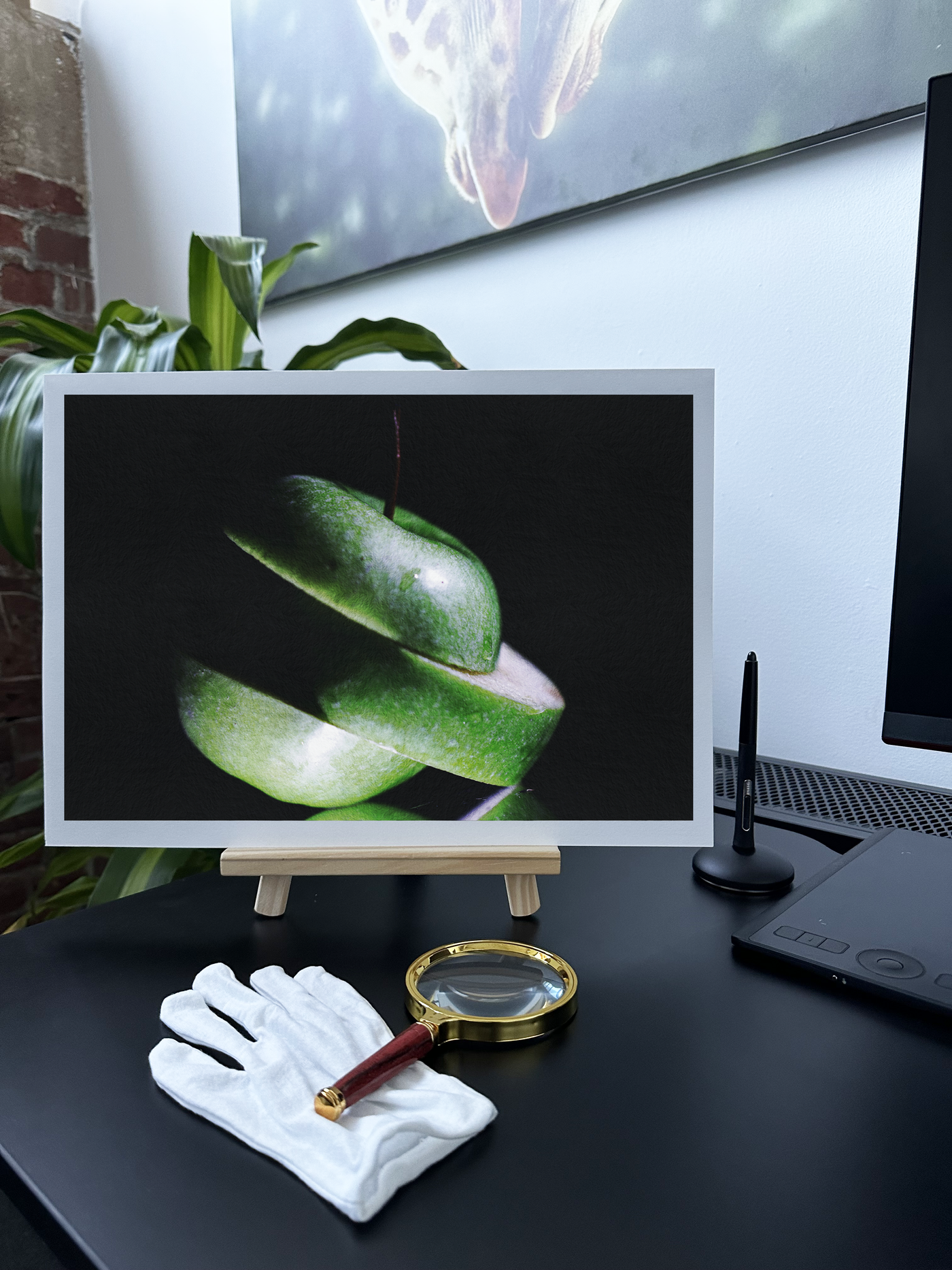 This Fine Art print is perfect for those who appreciate minimalist art with a twist, food photography enthusiasts, or anyone looking to bring a fresh, crisp energy to their décor. The play of light and shadow, combined with the rich textures, ensures that this image remains captivating from every angle, inviting repeated viewing and contemplation.