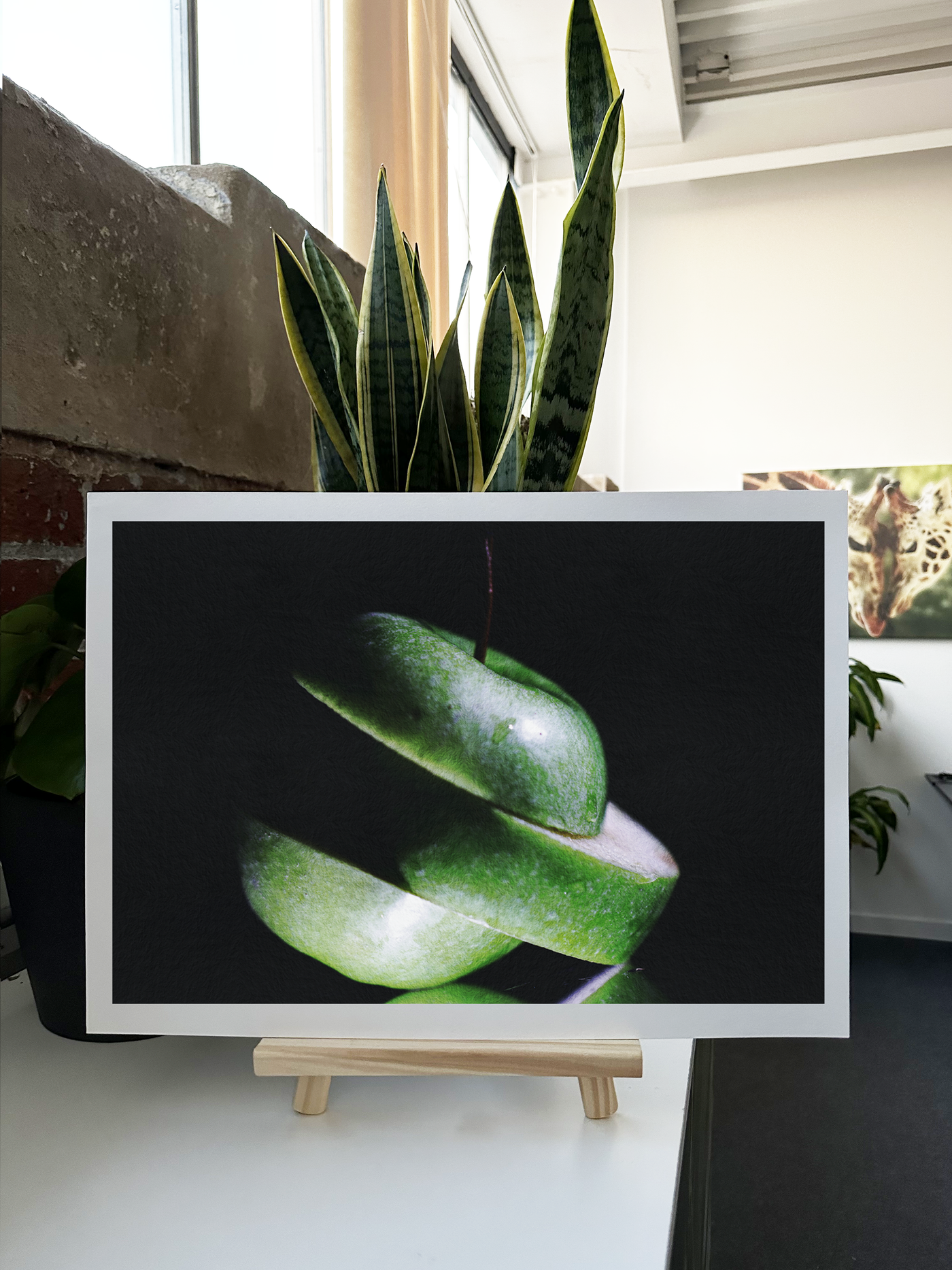 This striking Fine Art print captures the essence of simplicity and freshness in a boldly minimalist style. The photograph showcases a vibrant green apple, artfully sliced to create an elegant spiral against a deep black background. The contrast is stark and compelling, drawing the eye immediately to the subject.