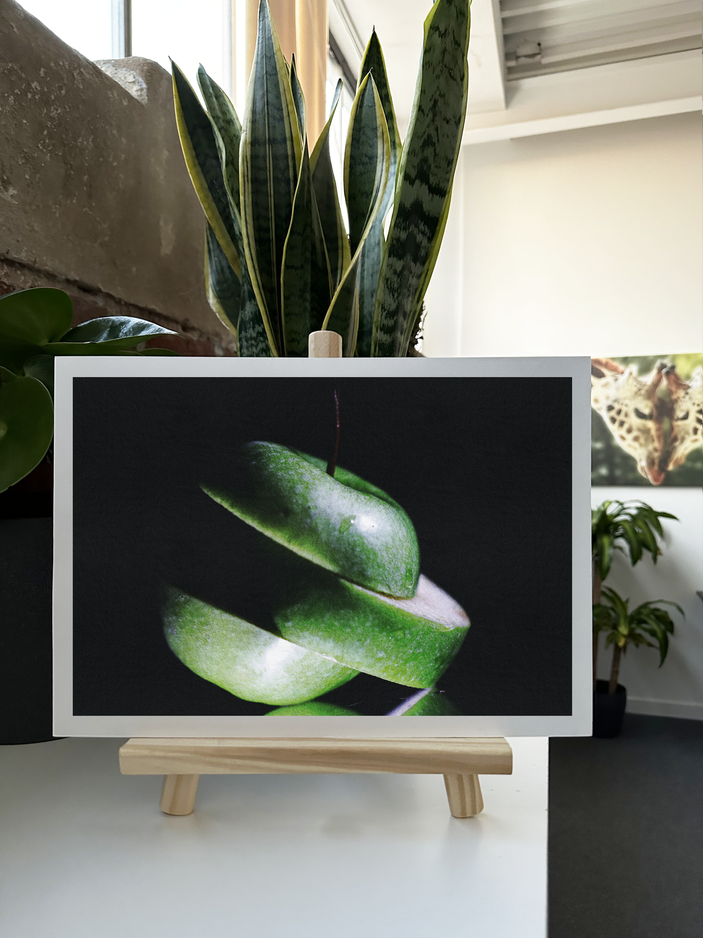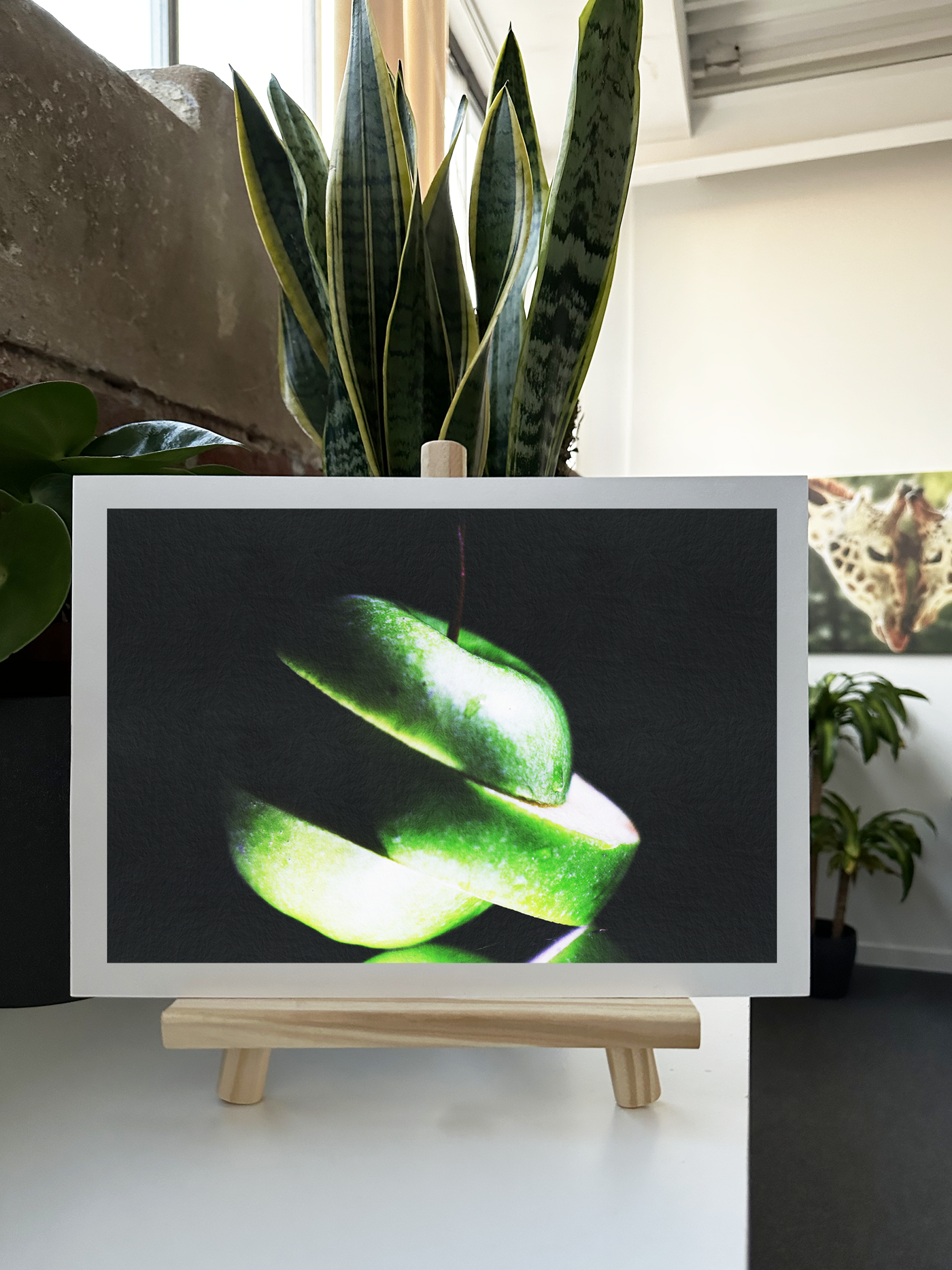 This striking Fine Art print captures the essence of simplicity and freshness in a boldly minimalist style. The photograph showcases a vibrant green apple, artfully sliced to create an elegant spiral against a deep black background. The contrast is stark and compelling, drawing the eye immediately to the subject.