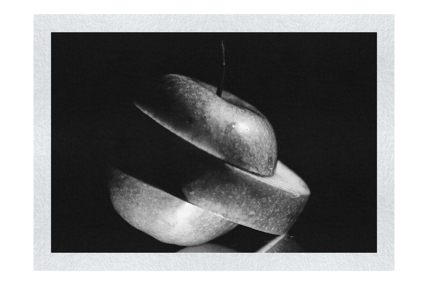 This striking Monochrome Fine Art print captures the essence of simplicity and freshness in a boldly minimalist style. The photograph showcases a vibrant silver apple, artfully sliced to create an elegant spiral against a deep black background. The contrast is stark and compelling, drawing the eye immediately to the subject.