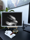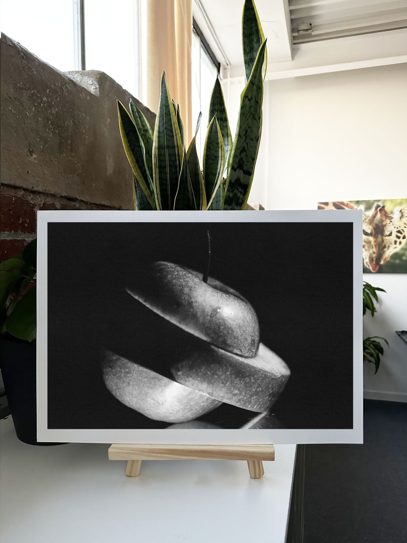 This striking Monochrome Fine Art print captures the essence of simplicity and freshness in a boldly minimalist style. The photograph showcases a vibrant silver apple, artfully sliced to create an elegant spiral against a deep black background. The contrast is stark and compelling, drawing the eye immediately to the subject.