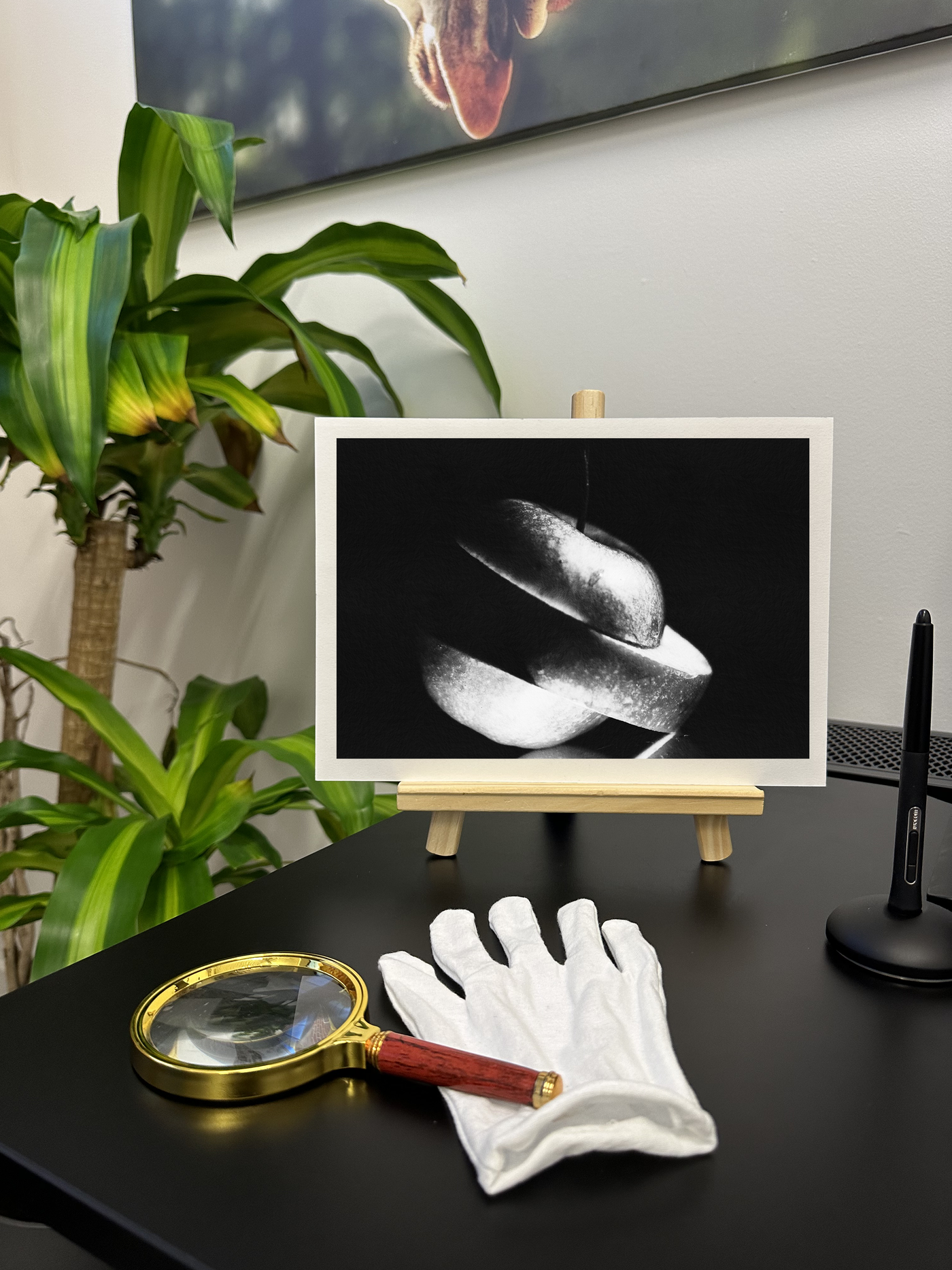 Printed on high-quality Fine Art paper, this piece will add a touch of modern sophistication to any space. Its clean lines and vivid Monochrome hues make it an ideal accent for contemporary kitchens, dining areas, or any room where you want to introduce a pop of natural vibrancy against a sleek, dark backdrop.