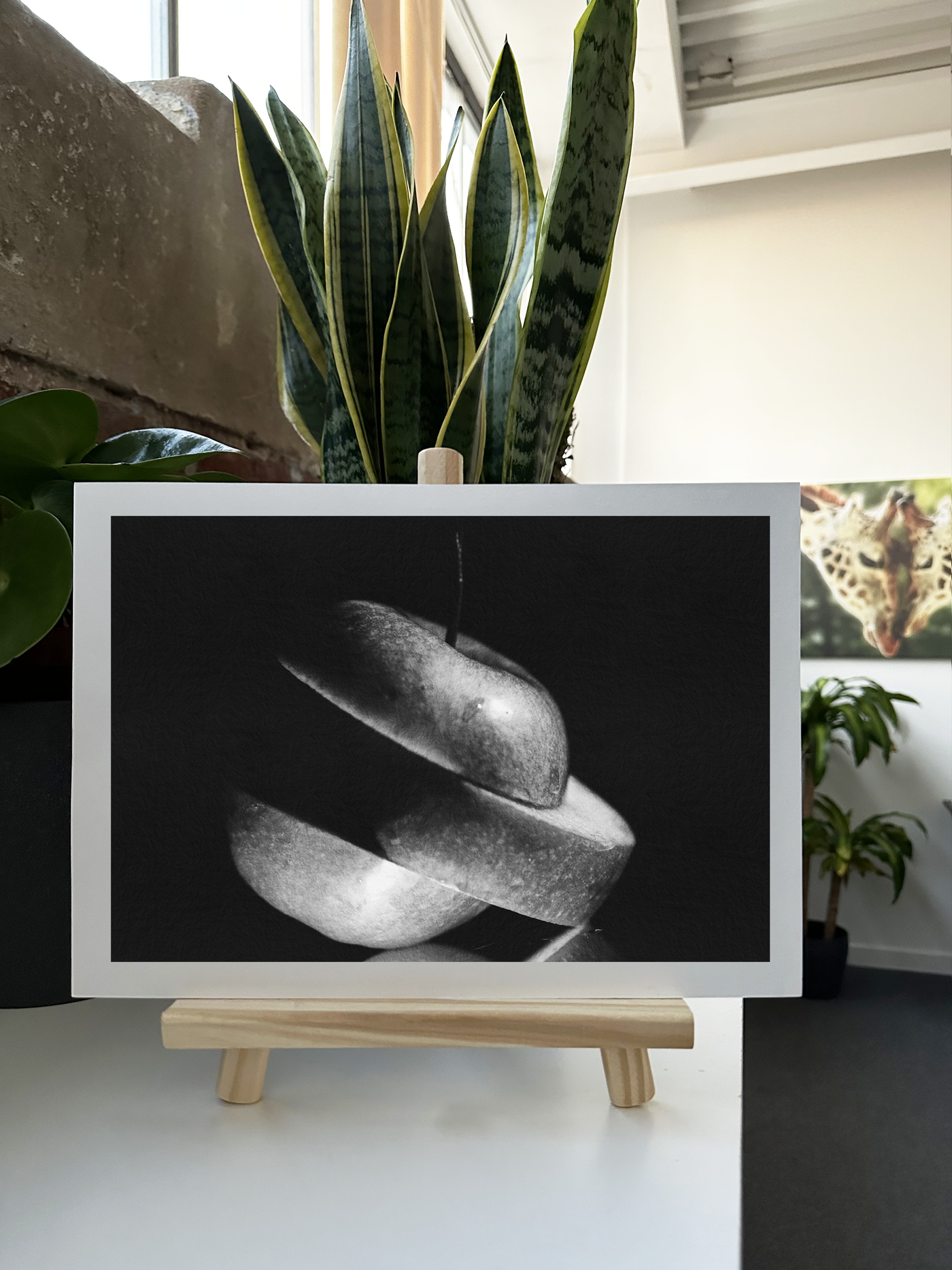 This striking Monochrome Fine Art print captures the essence of simplicity and freshness in a boldly minimalist style. The photograph showcases a vibrant silver apple, artfully sliced to create an elegant spiral against a deep black background. The contrast is stark and compelling, drawing the eye immediately to the subject.