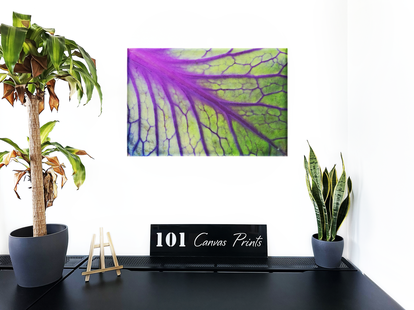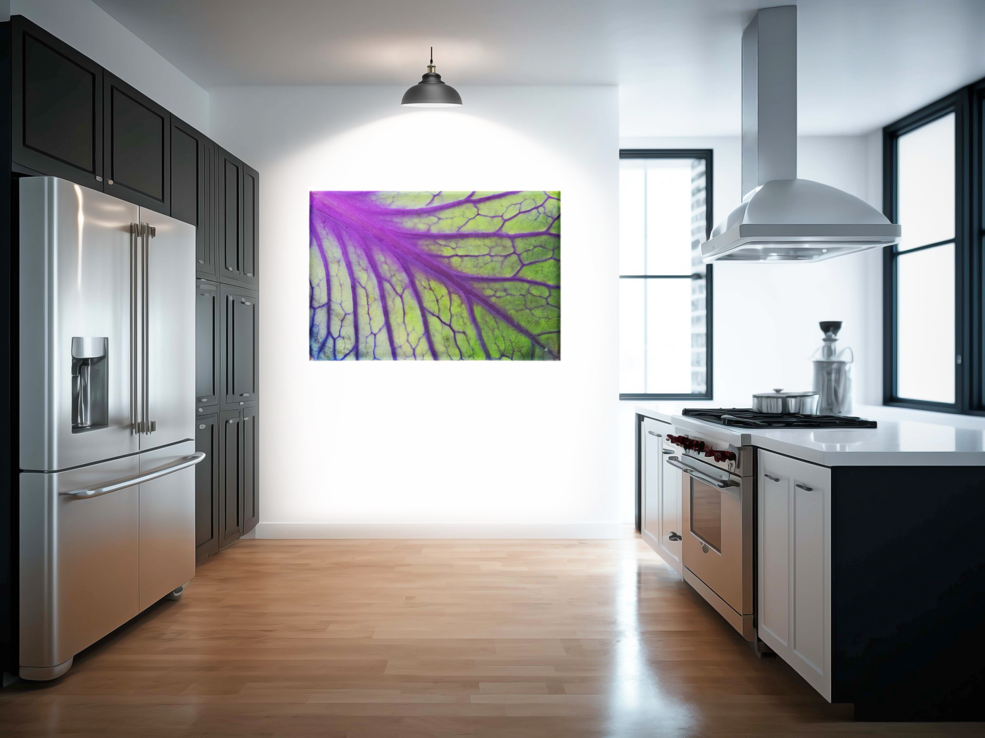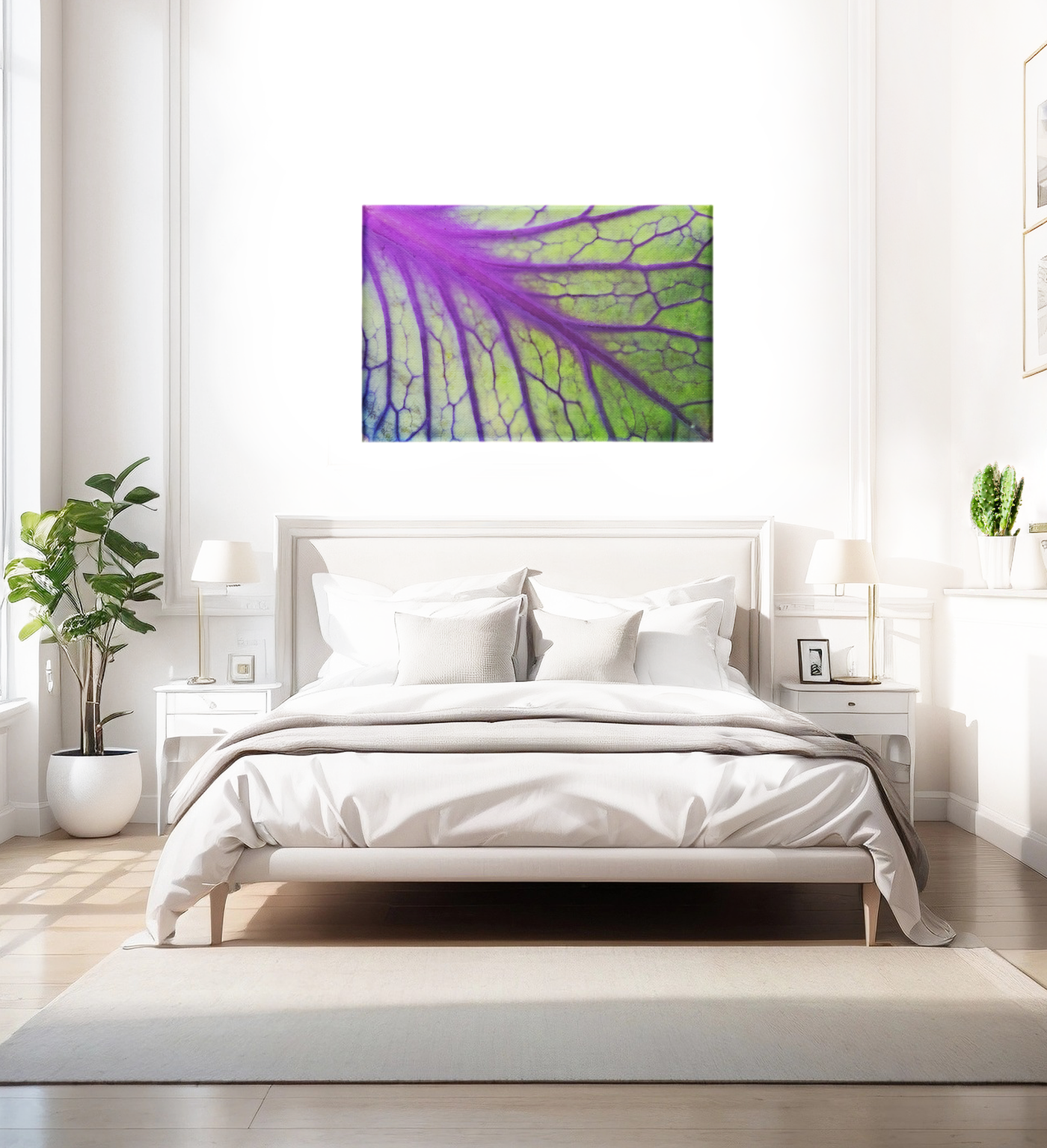 This breathtaking acrylic-set print reveals the hidden artistry within a leaf, magnifying its vein structure to create a mesmerising work of natural abstract art. The composition focuses on the leaf's intricate network of veins, transforming a common natural object into an extraordinary visual experience. The dominant purple vein sweeps across the frame, from which smaller veins branch out in a fascinating display of organic geometry.