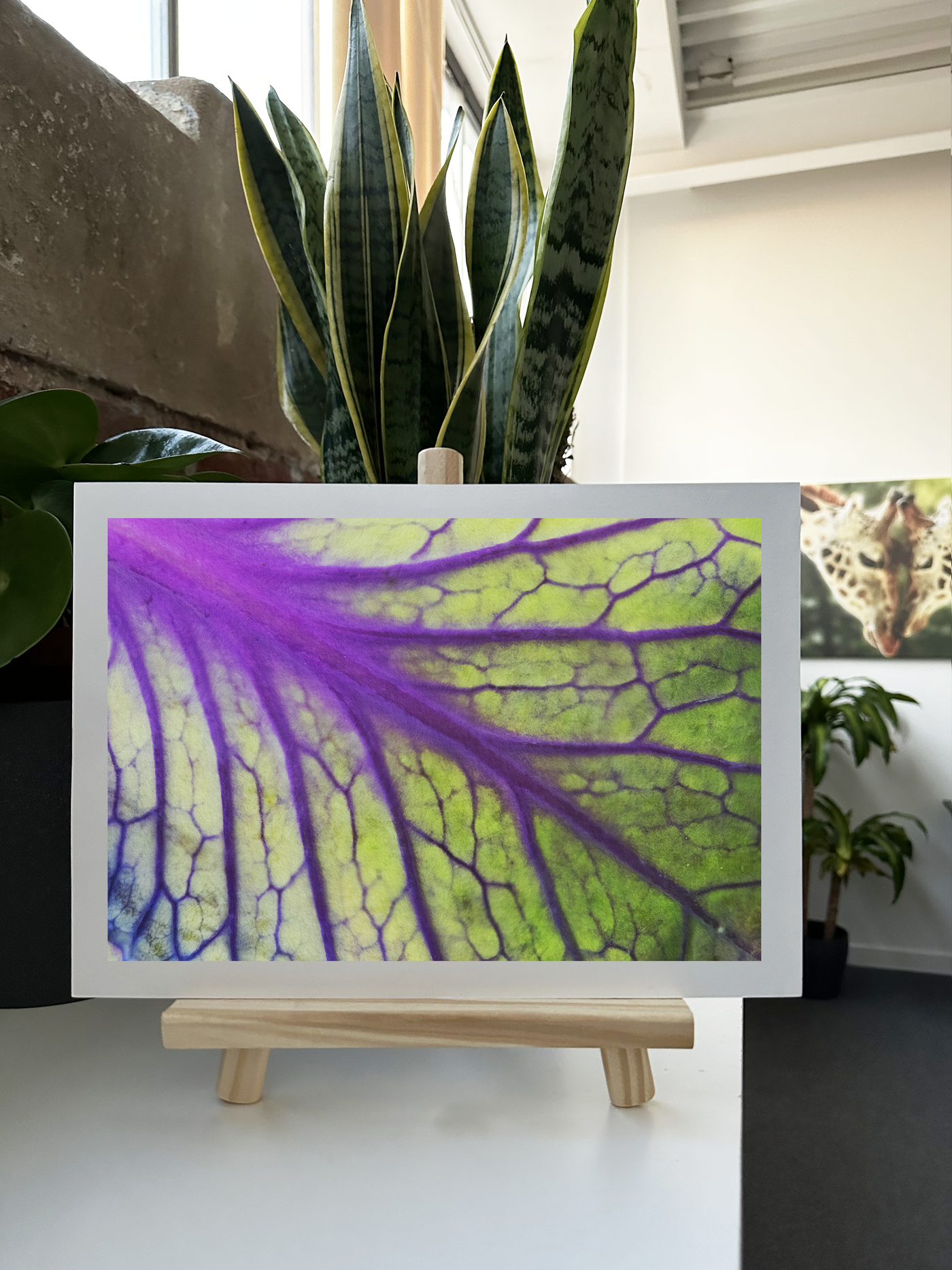 This breathtaking Fine Art print reveals the hidden artistry within a leaf, magnifying its vein structure to create a mesmerising work of natural abstract art. The composition focuses on the leaf's intricate network of veins, transforming a common natural object into an extraordinary visual experience. The dominant purple vein sweeps across the frame, from which smaller veins branch out in a fascinating display of organic geometry.