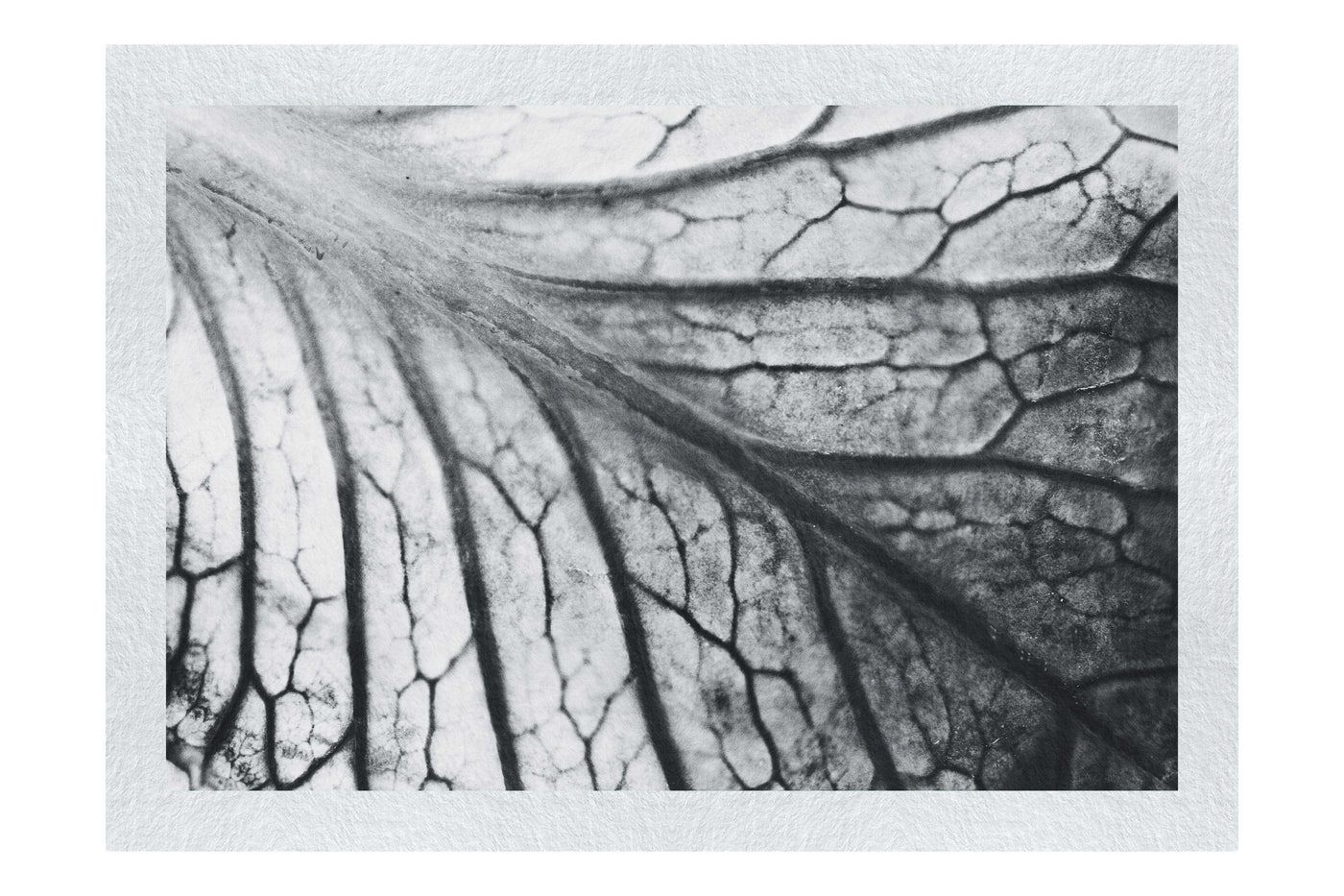 This breathtaking Monochrome Fine Art print reveals the hidden artistry within a leaf, magnifying its vein structure to create a mesmerising work of natural abstract art. The composition focuses on the leaf's intricate network of veins, transforming a common natural object into an extraordinary visual experience. The dominant silvery vein sweeps across the frame, from which smaller veins branch out in a fascinating display of organic geometry.