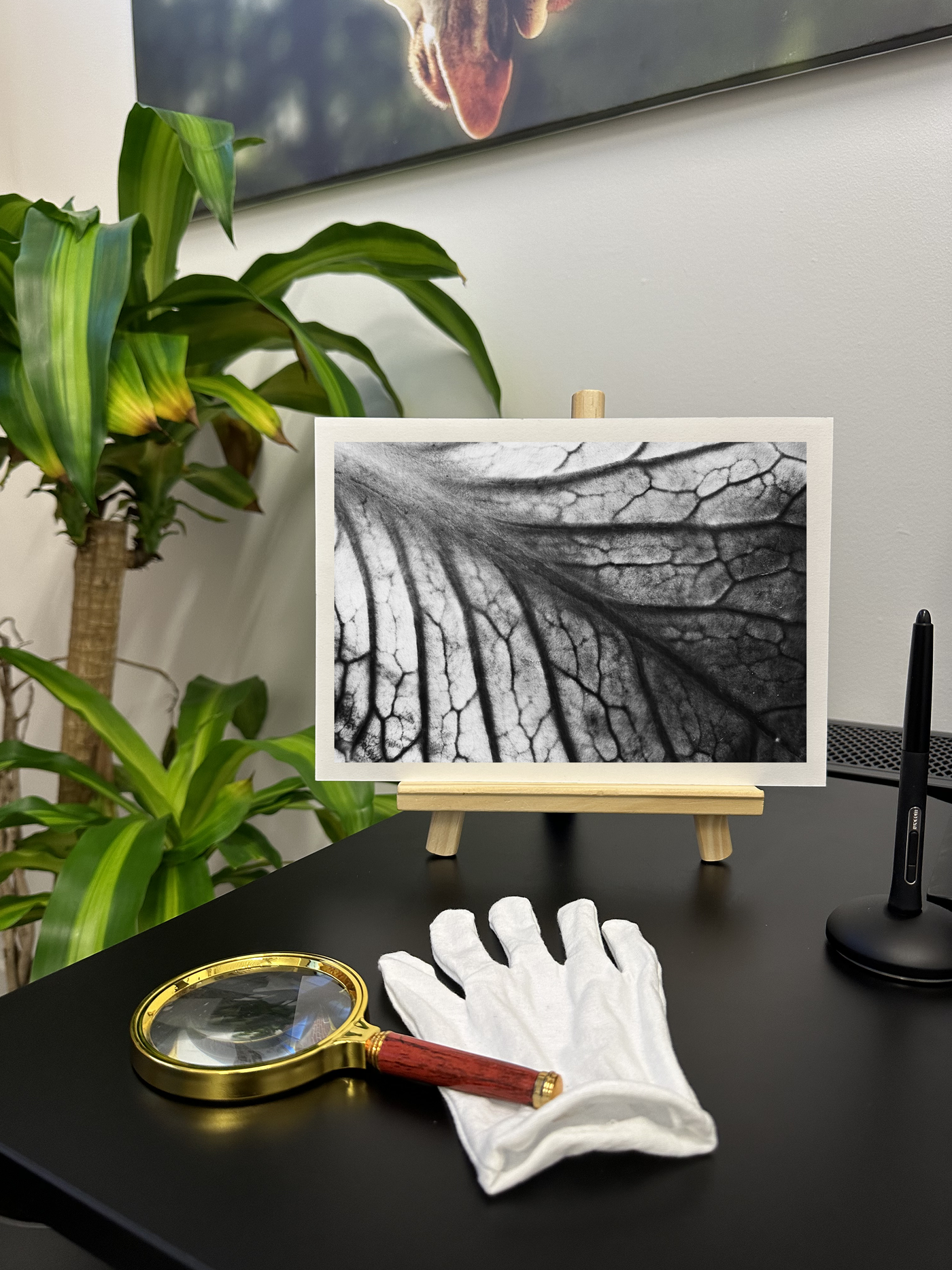 This breathtaking Monochrome Fine Art print reveals the hidden artistry within a leaf, magnifying its vein structure to create a mesmerising work of natural abstract art. The composition focuses on the leaf's intricate network of veins, transforming a common natural object into an extraordinary visual experience. The dominant silvery vein sweeps across the frame, from which smaller veins branch out in a fascinating display of organic geometry.