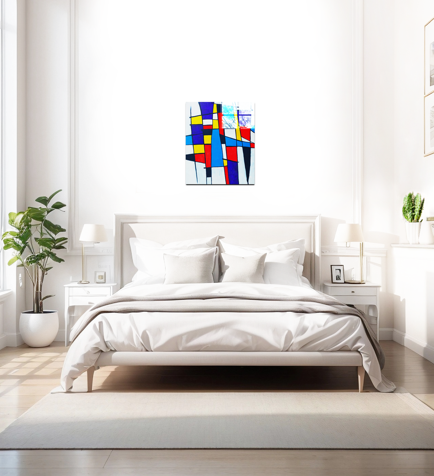 "Visperas", expertly reproduced by the 101 Canvas Prints team, transforms cherished memories of a Filipino Easter celebration into a contemporary geometric abstraction. The artwork's strong linear elements and bold colour blocks echo the artist's memories of decorating village streets, where banderitas would criss-cross overhead and whitewashed gutters would gleam in anticipation of the Barrio Fiesta. Each intersection of line and colour represents the coming together of community in celebration.