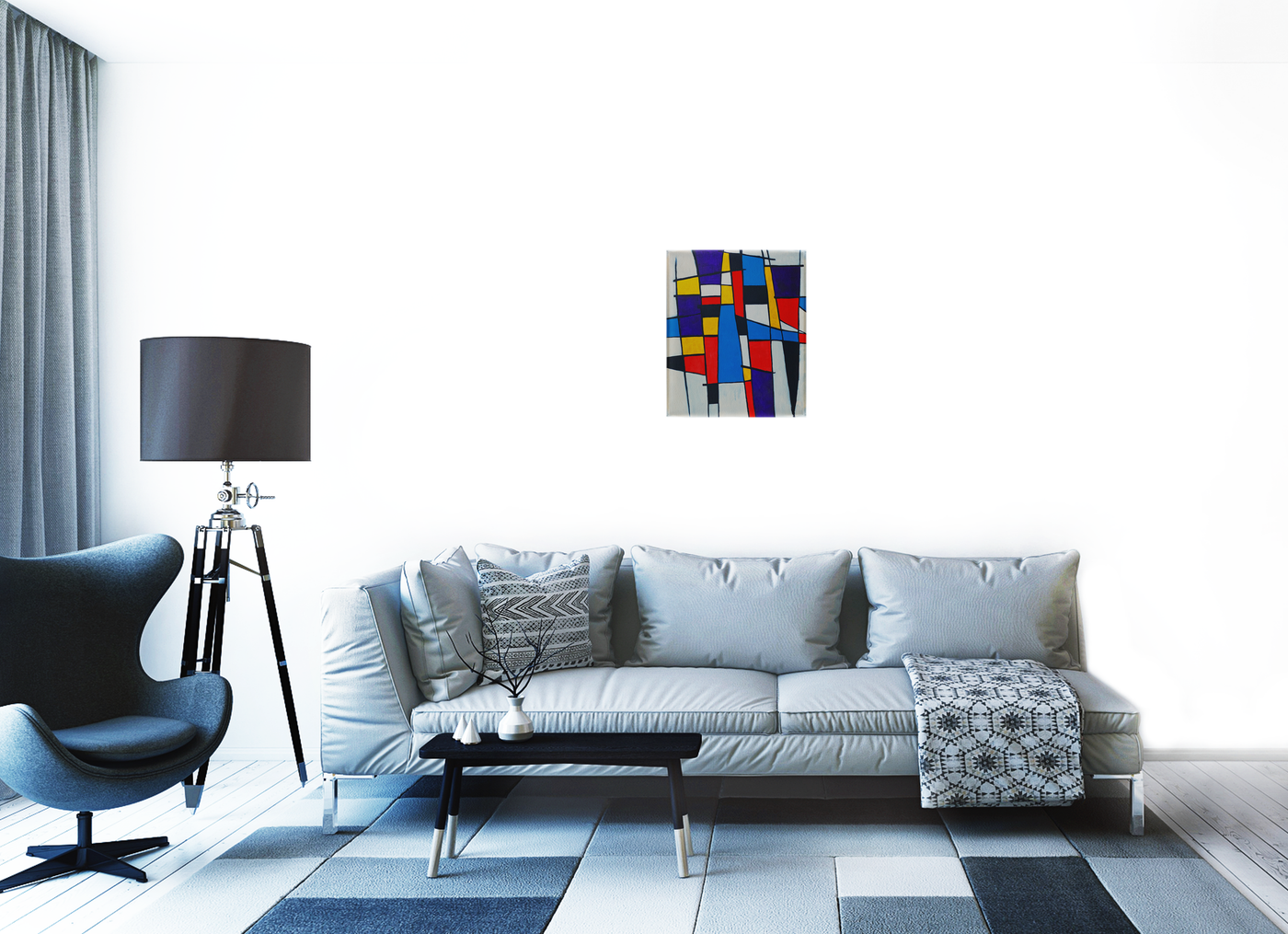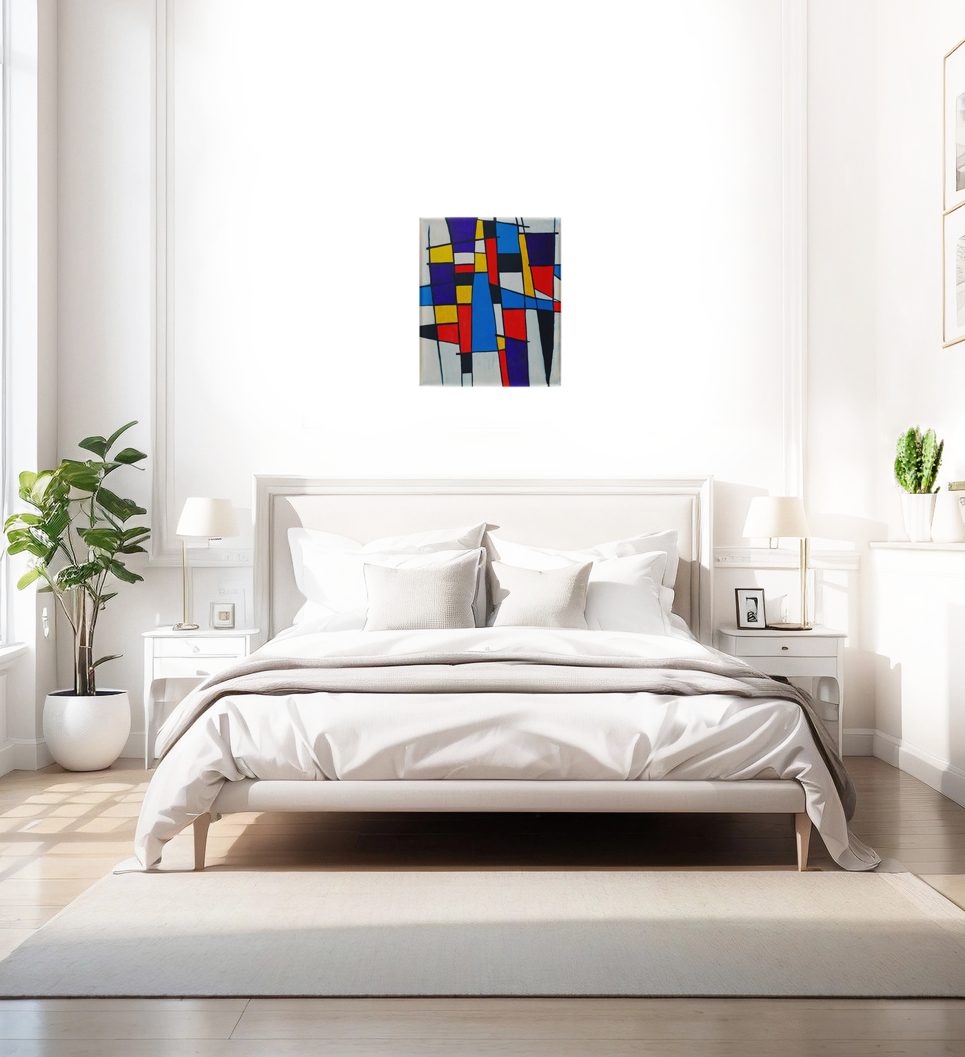 Masterfully captured by the 101 Canvas Prints photography team, this geometric composition evokes the vibrant atmosphere of a Filipino Easter celebration. Inspired by the artist's teenage memories of decorating village streets for Visperas, the painting's criss-crossing lines and blocks of colour mirror the banderitas (buntings) that would create festive canopies overhead. The strong vertical elements suggest the lamp posts and trees that once held these colourful decorations, while the intersecting patterns capture the communal spirit of the Barrio Fiesta.