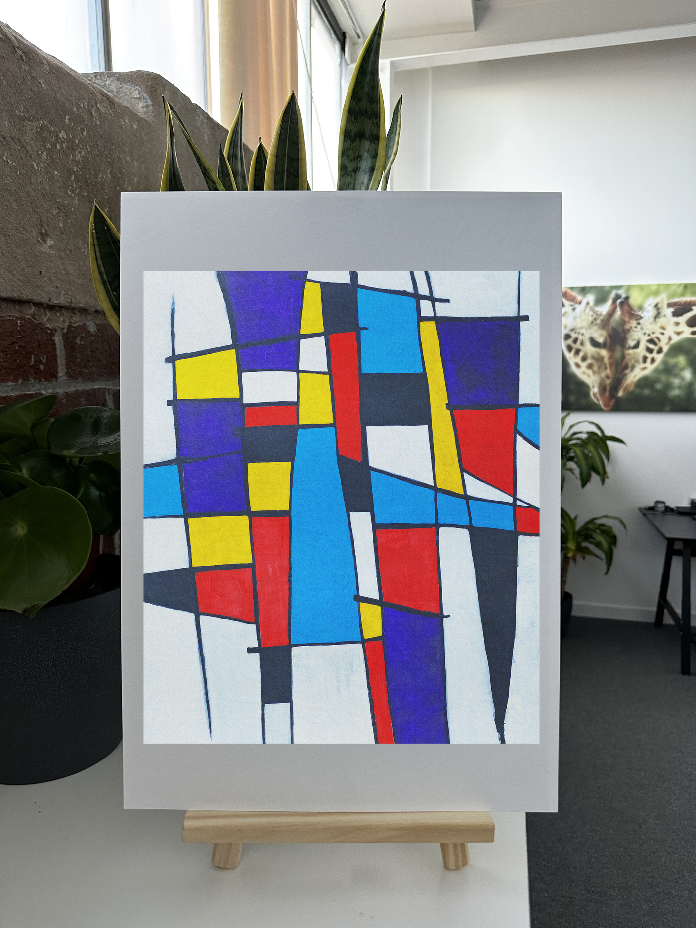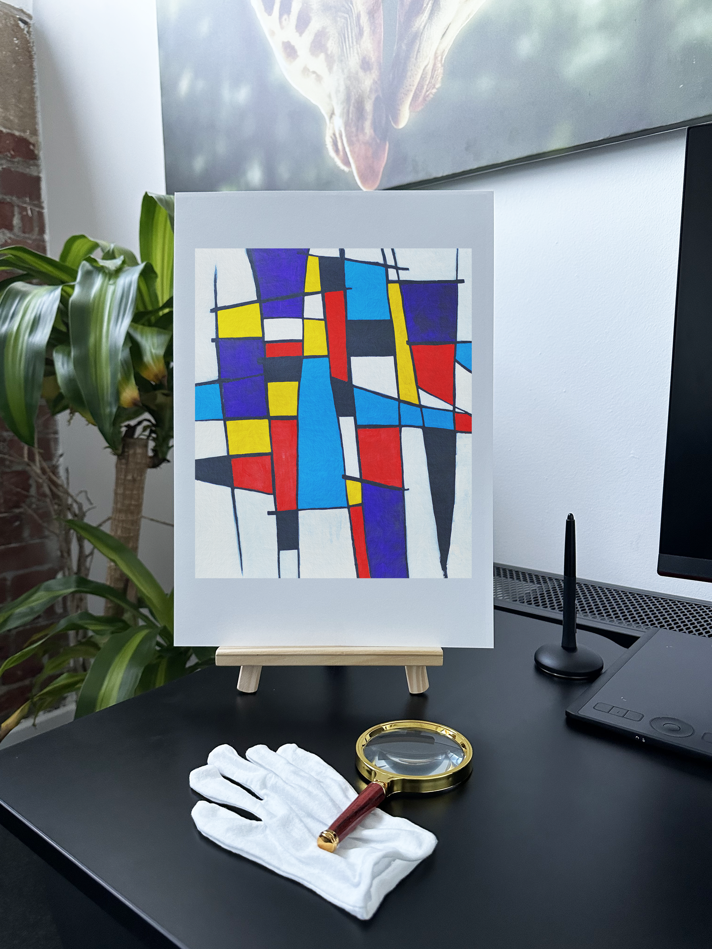 The colour palette is joyously celebratory, combining deep royal blues, bright primary reds, and sunny yellows with pure whites that recall the calboro-painted gutters. Our print enhancement team have preserved the precise edges and clean lines that give this piece its architectural quality, while maintaining the vibrant energy that speaks to the festive nature of the celebration. Each geometric section seems to dance with its neighbours, creating a rhythm that echoes the street party's atmosphere.