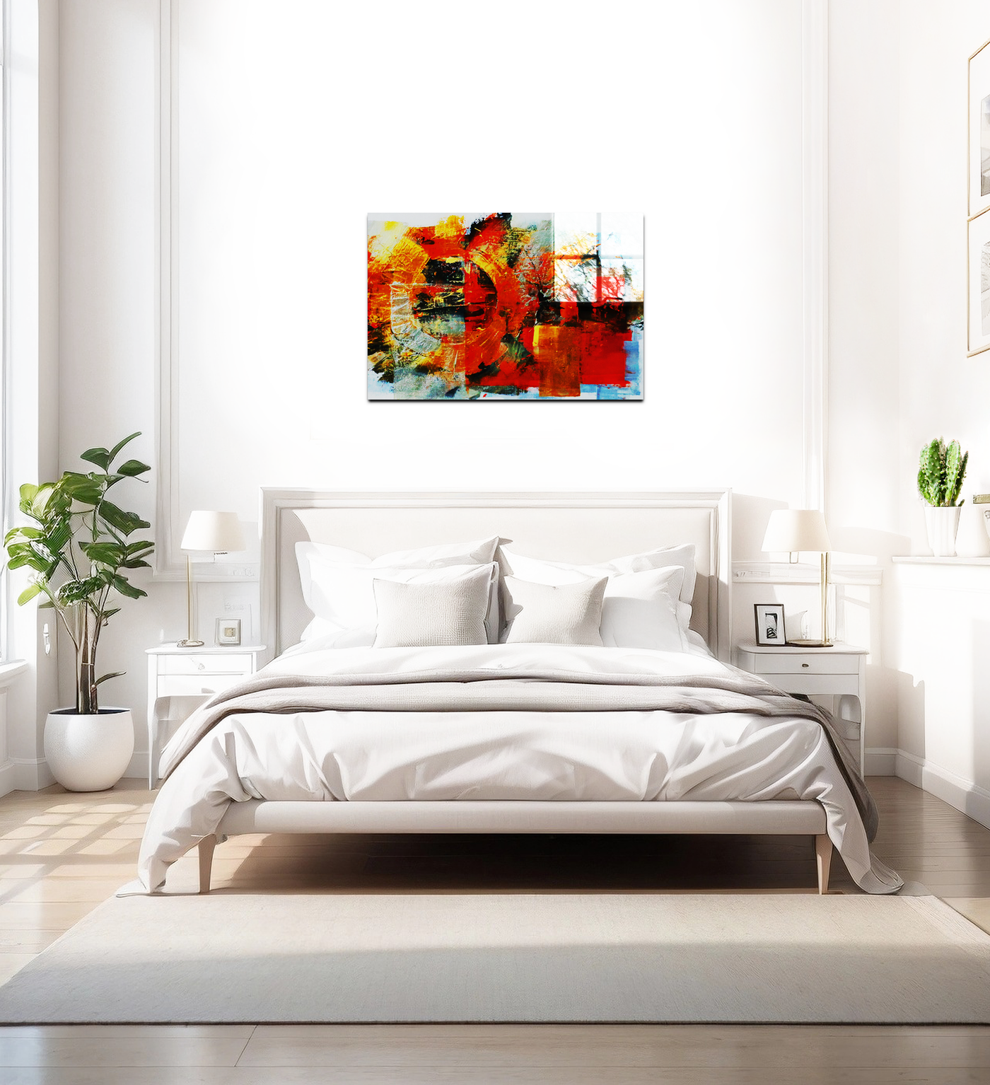 The artist's mastery of colour brings out an extraordinary range of reds and golds that seem to burn with inner light, suggesting both earthly passion and divine presence. Through our precise photography and print enhancement process, we've maintained every nuance of the original artwork's emotional intensity, from the bold gestural movements to the subtle spiritual undertones that emerge from the composition's depths. The result is an image that serves both as a celebration of faith and a powerful piece of contemporary art.