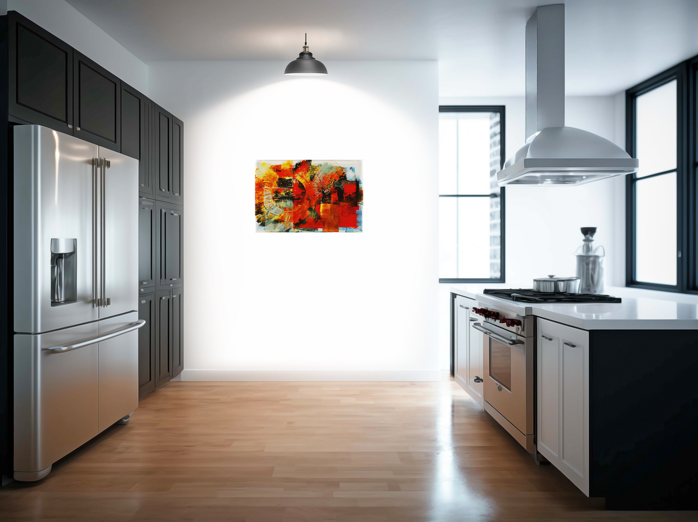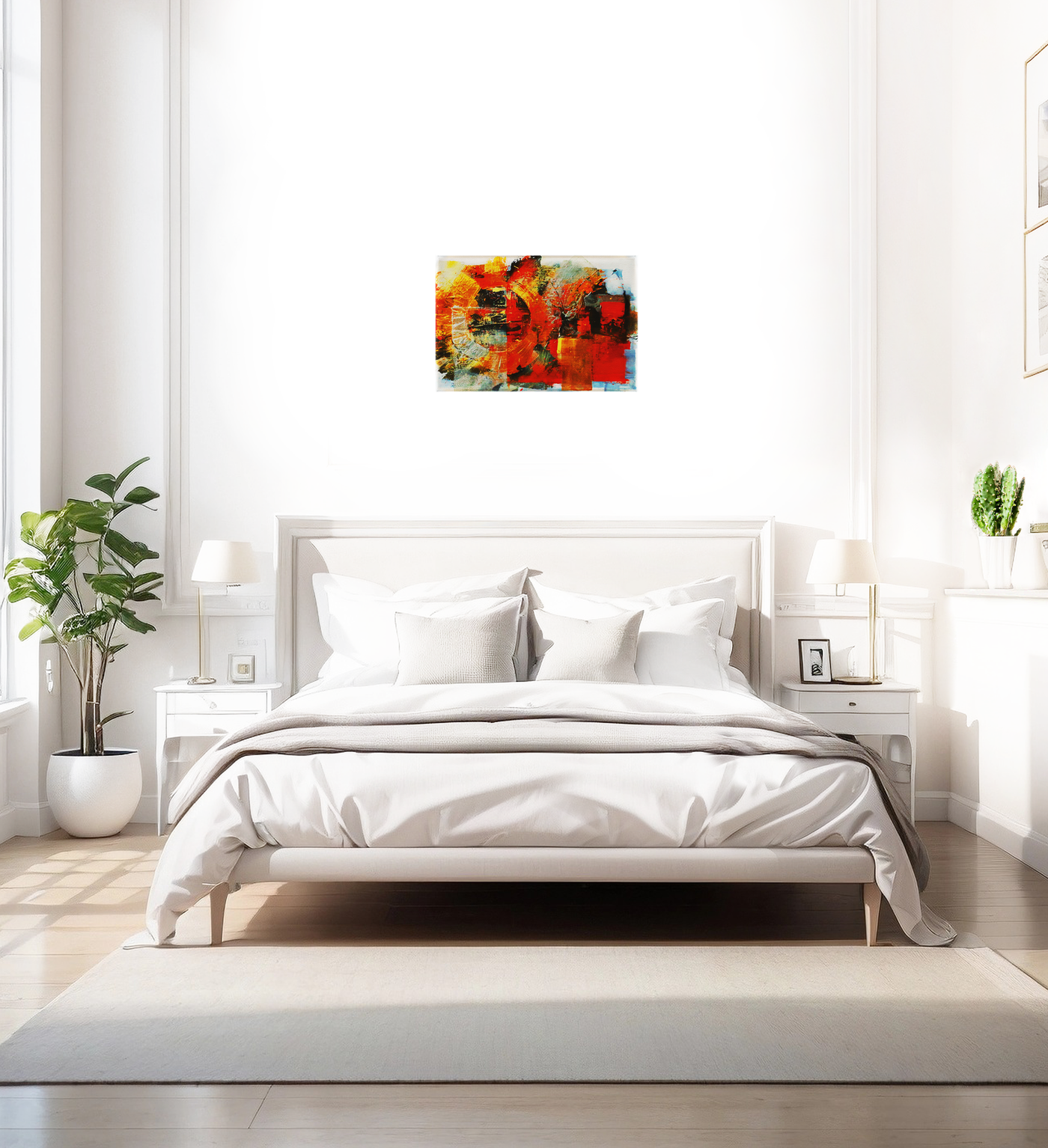 The colour palette burns with intensity, dominated by deep crimsons and blazing oranges that seem to emerge from darkness, with touches of celestial blue providing divine contrast. Our print enhancement team have carefully preserved every energetic brushstroke and textural detail that gives this piece its raw emotional power, from the dramatic sweeps of red that dominate the composition to the subtle interplay of light and shadow that suggests spiritual presence.