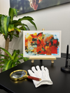 The colour palette burns with intensity, dominated by deep crimsons and blazing oranges that seem to emerge from darkness, with touches of celestial blue providing divine contrast. Our editing team has carefully preserved every energetic brushstroke and textural detail that gives this piece its raw emotional power, from the dramatic sweeps of red that dominate the composition to the subtle interplay of light and shadow that suggests spiritual presence.